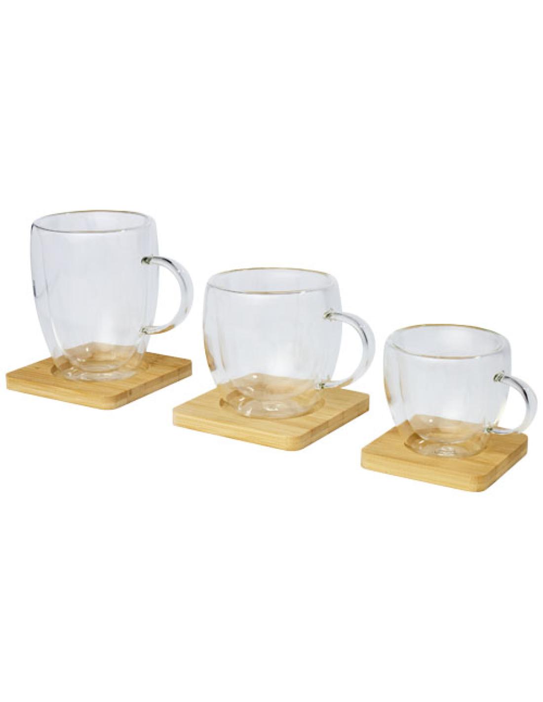 Un set de dos tazas térmicas de doble pared con posavasos de bambú. El bambú procede de fuentes sostenibles, ecológica y socialmente responsables. Gracias al vidrio borosilicato doble, las bebidas mantendrán su temperatura durante mucho tiempo. Capacidad de 100 ml. Tamaño del posavasos: 8 × 8 × 1 cm.