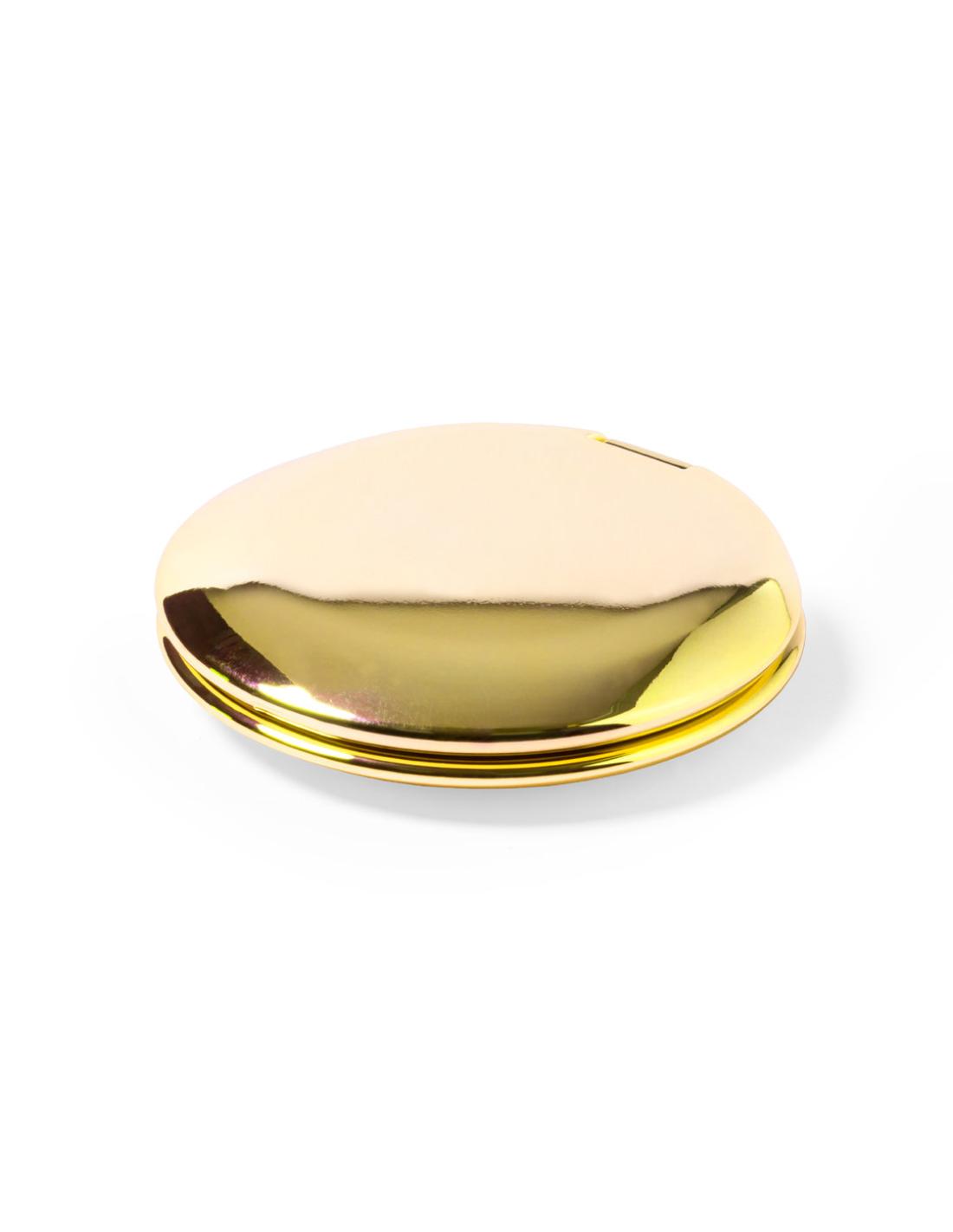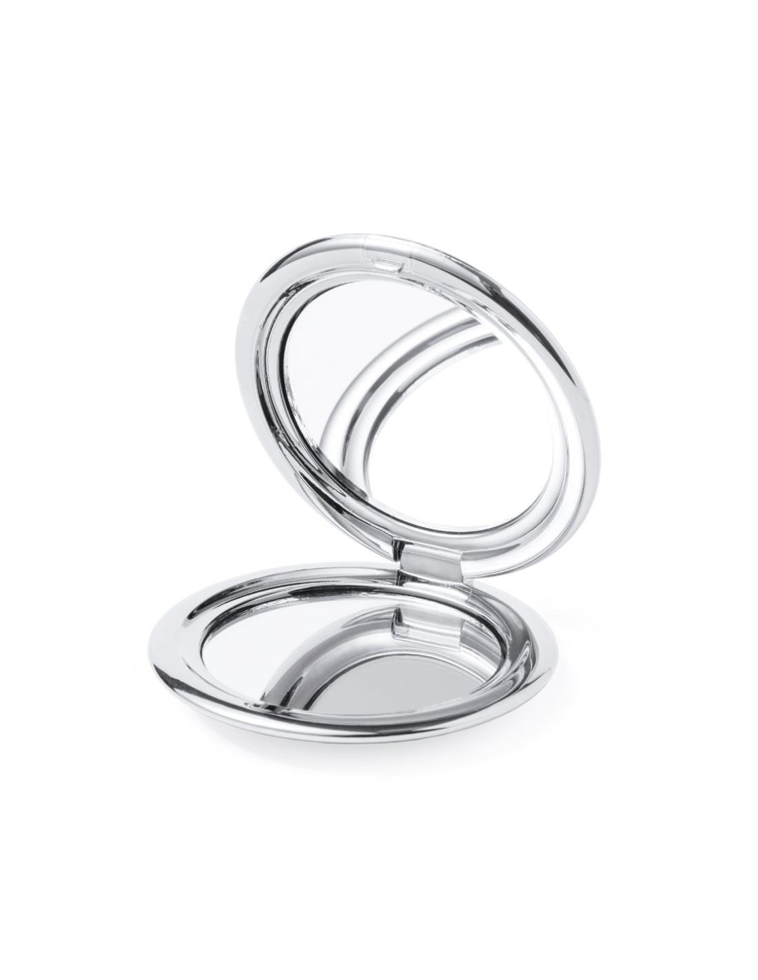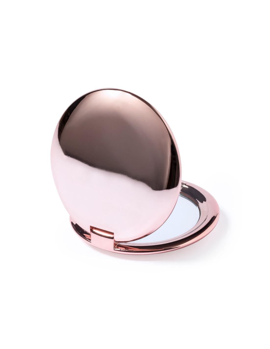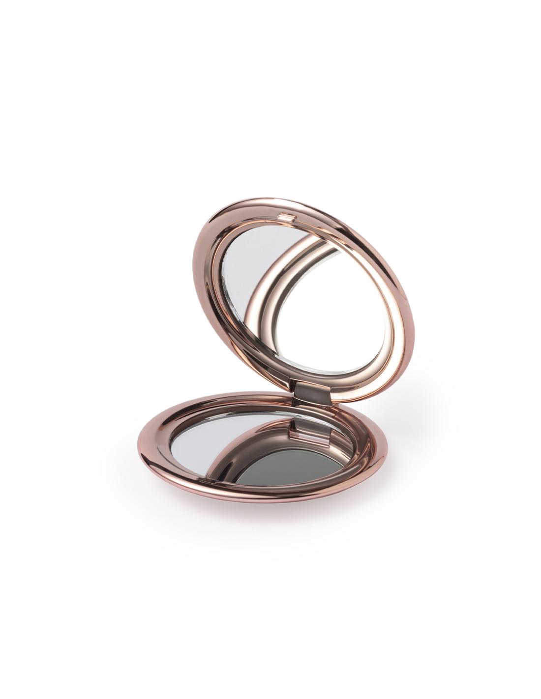 Espejo plegable en elegante acabado metalizado. Con dos espejos interiores (1X y aumento 2X), disponible en colores dorado, plateado y oro rosa.