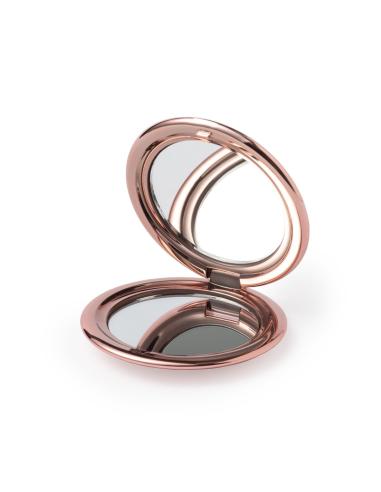 Espejo plegable en elegante acabado metalizado. Con dos espejos interiores (1X y aumento 2X), disponible en colores dorado, plateado y oro rosa.