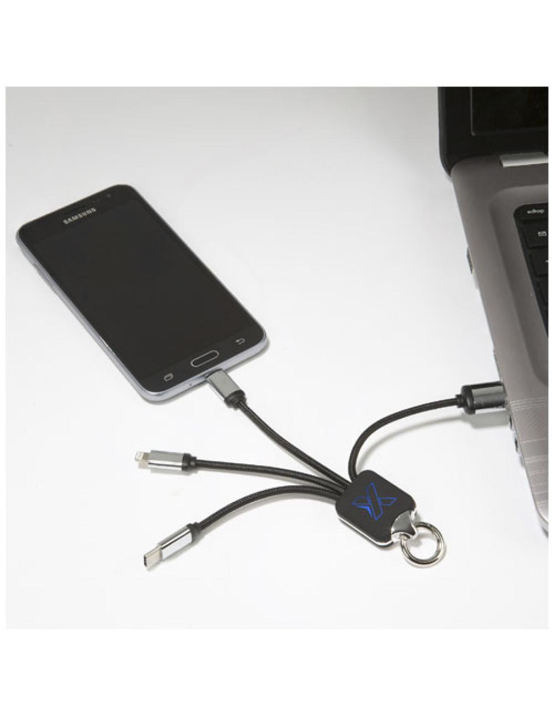 Cable de carga con logotipo retroiluminado con acabado de goma y metal provisto de tres conectores (tipo C, Android y iPhone). Se pueden cargar hasta tres dispositivos simultáneamente. Longitud de los cables (incluidos los conectores): 10 cm. Longitud total del cable: 1 metro. El embalaje está fabricado con papel reciclado y el cable RPET en plástico reciclado.