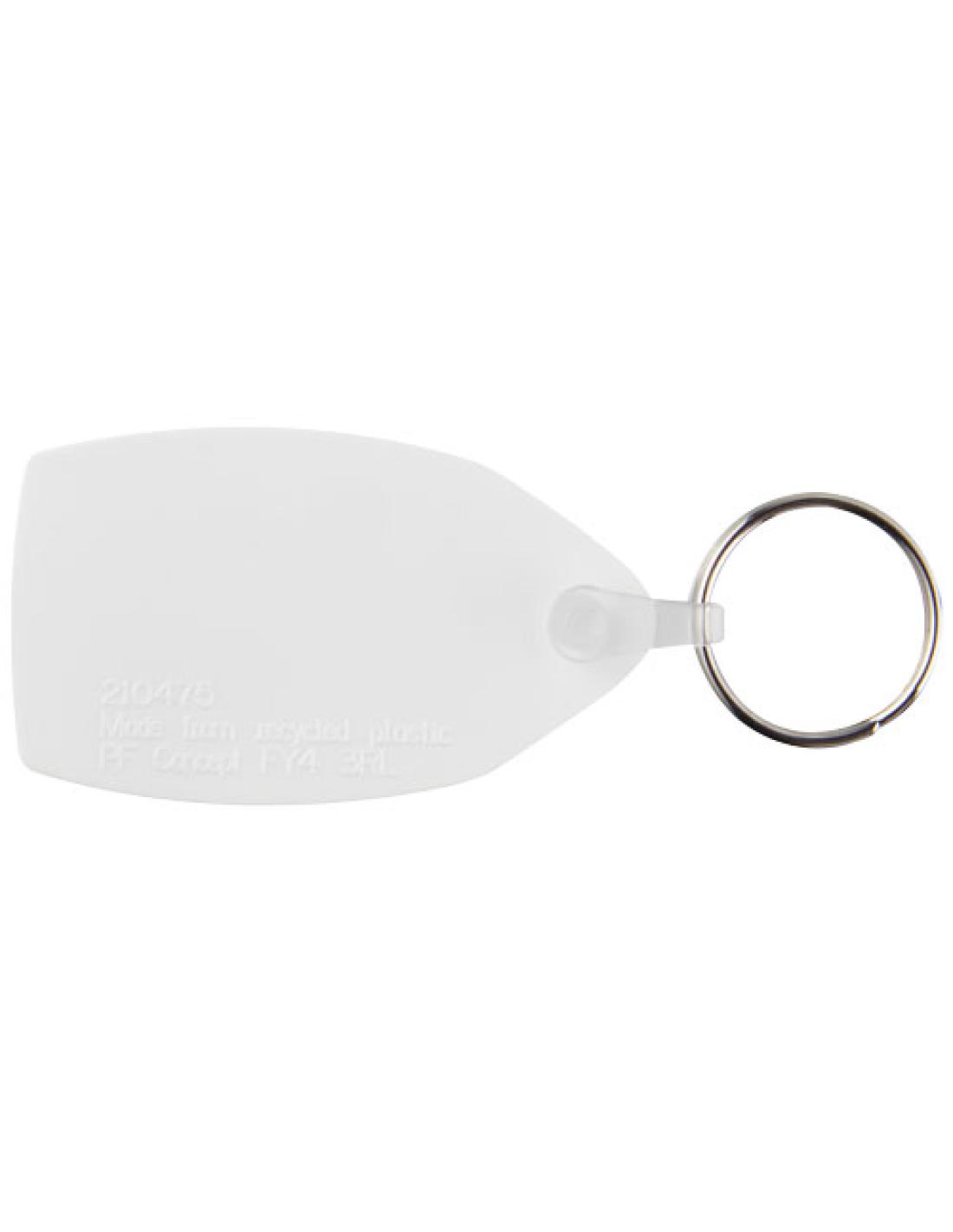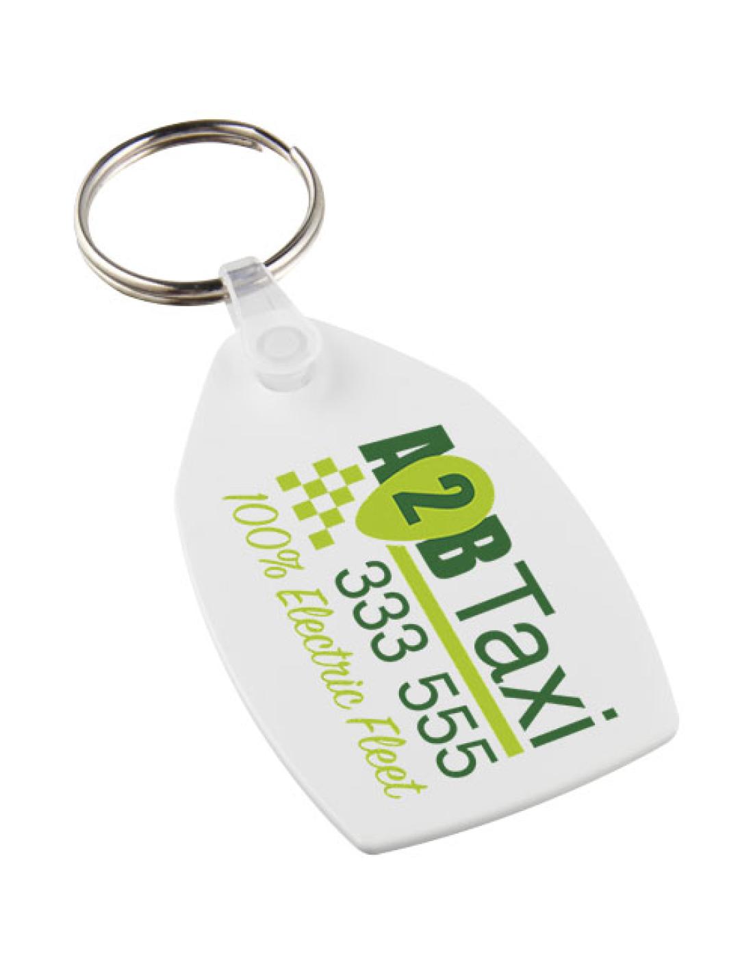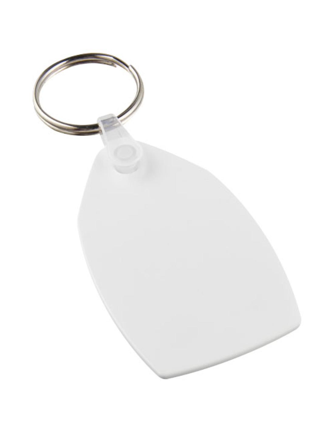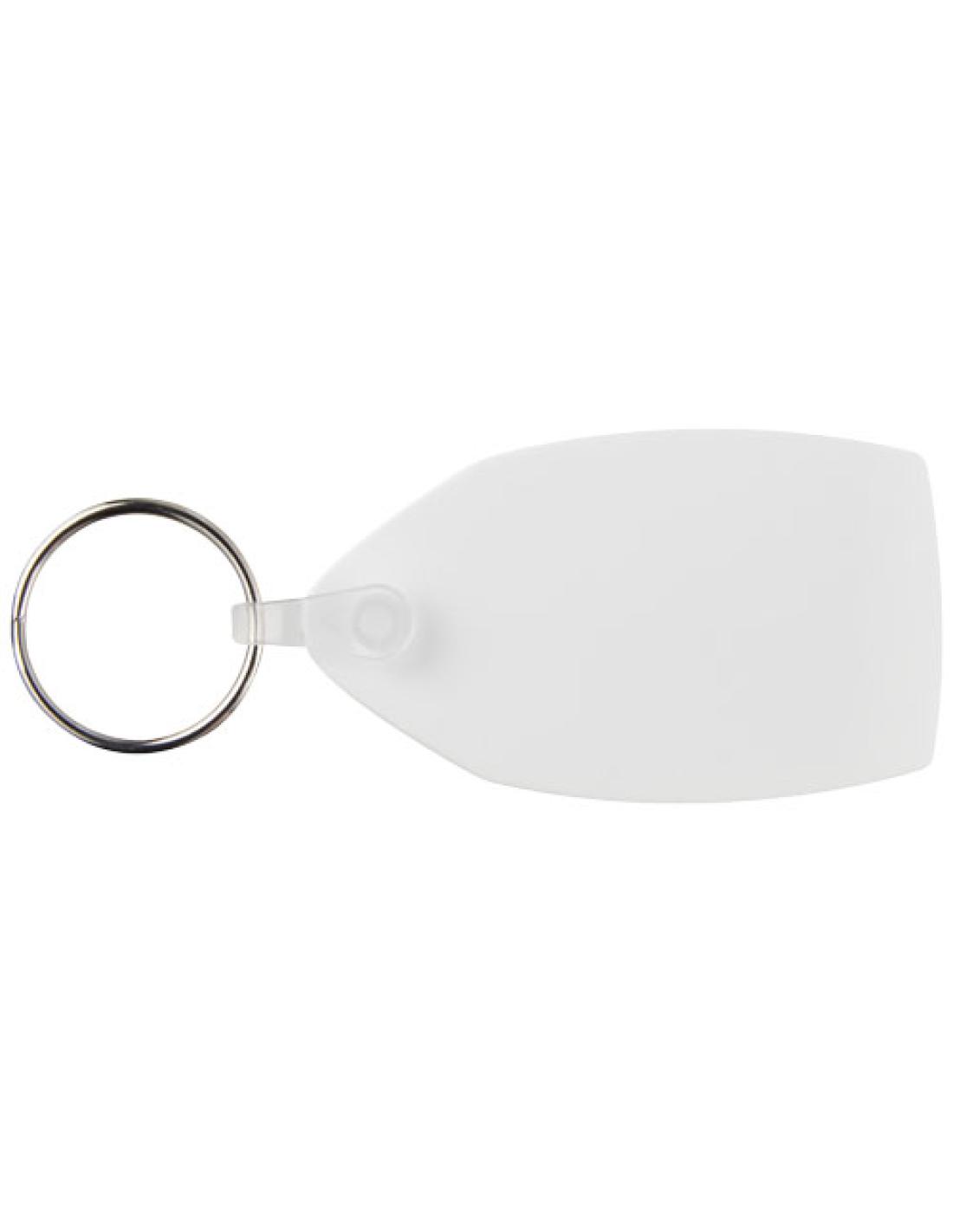 Llavero blanco en forma de rectángulo con anilla abierta de metal. La anilla de metal es de perfil plano, ideal para envíos por correo postal.