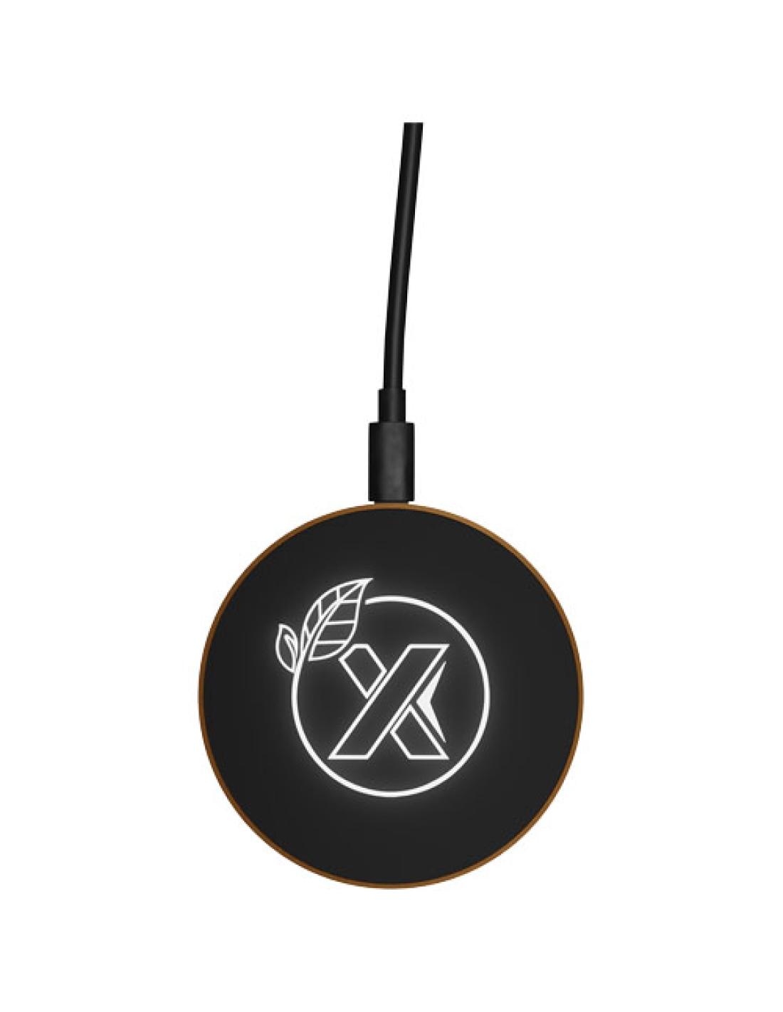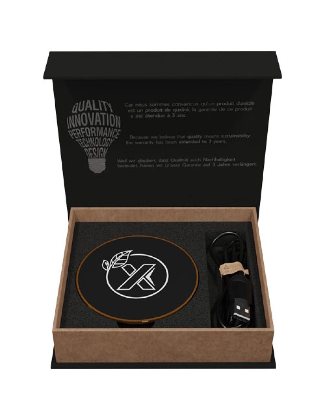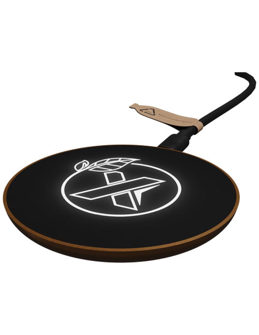 Estación de carga inalámbrica de 10 W hecha de goma y madera , con un cable de carga hecho de PET. Se puede decorar con un logotipo retroiluminado. Se entrega en una caja de regalo de papel kraft negro con mecanismo de cierre magnético. Patente EUROPA EUIPO.