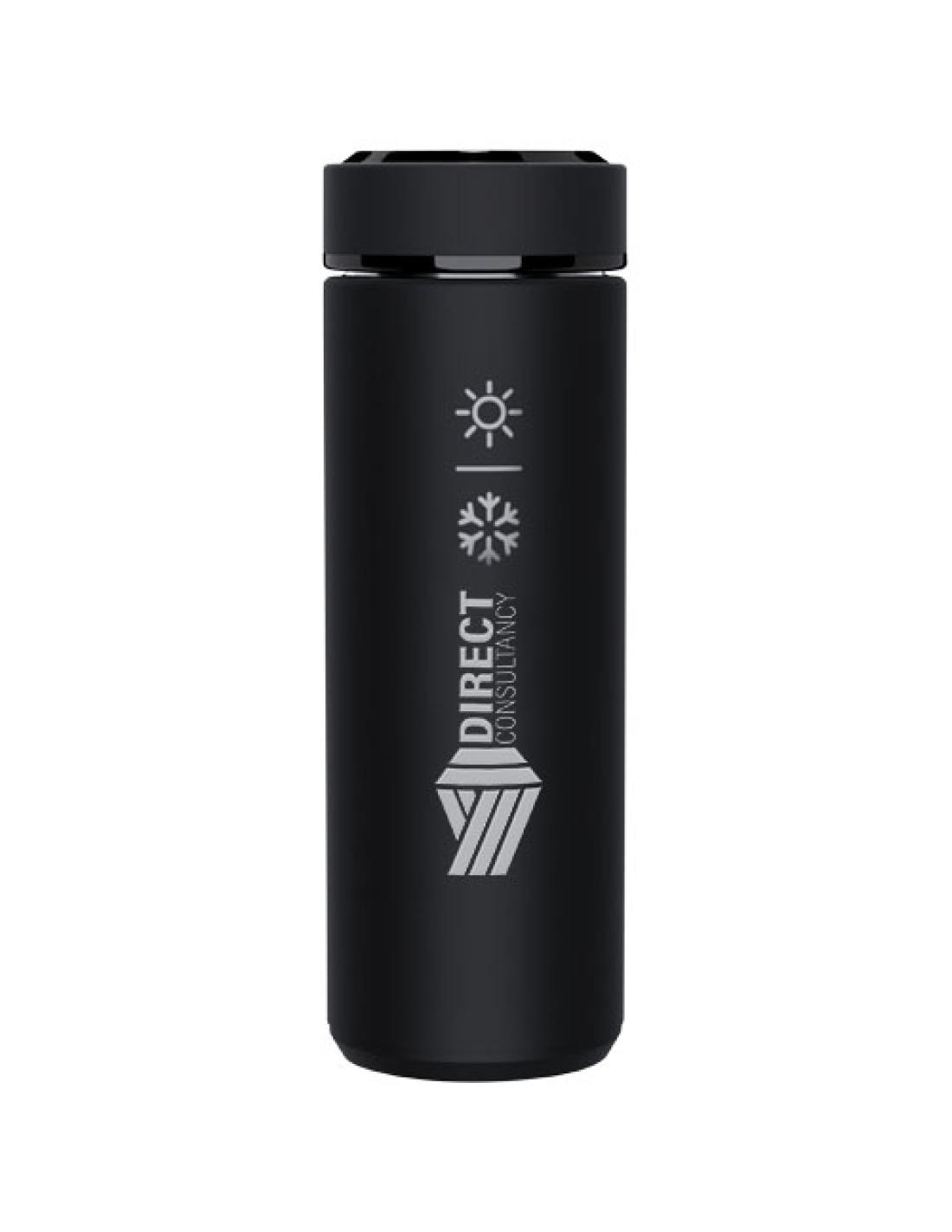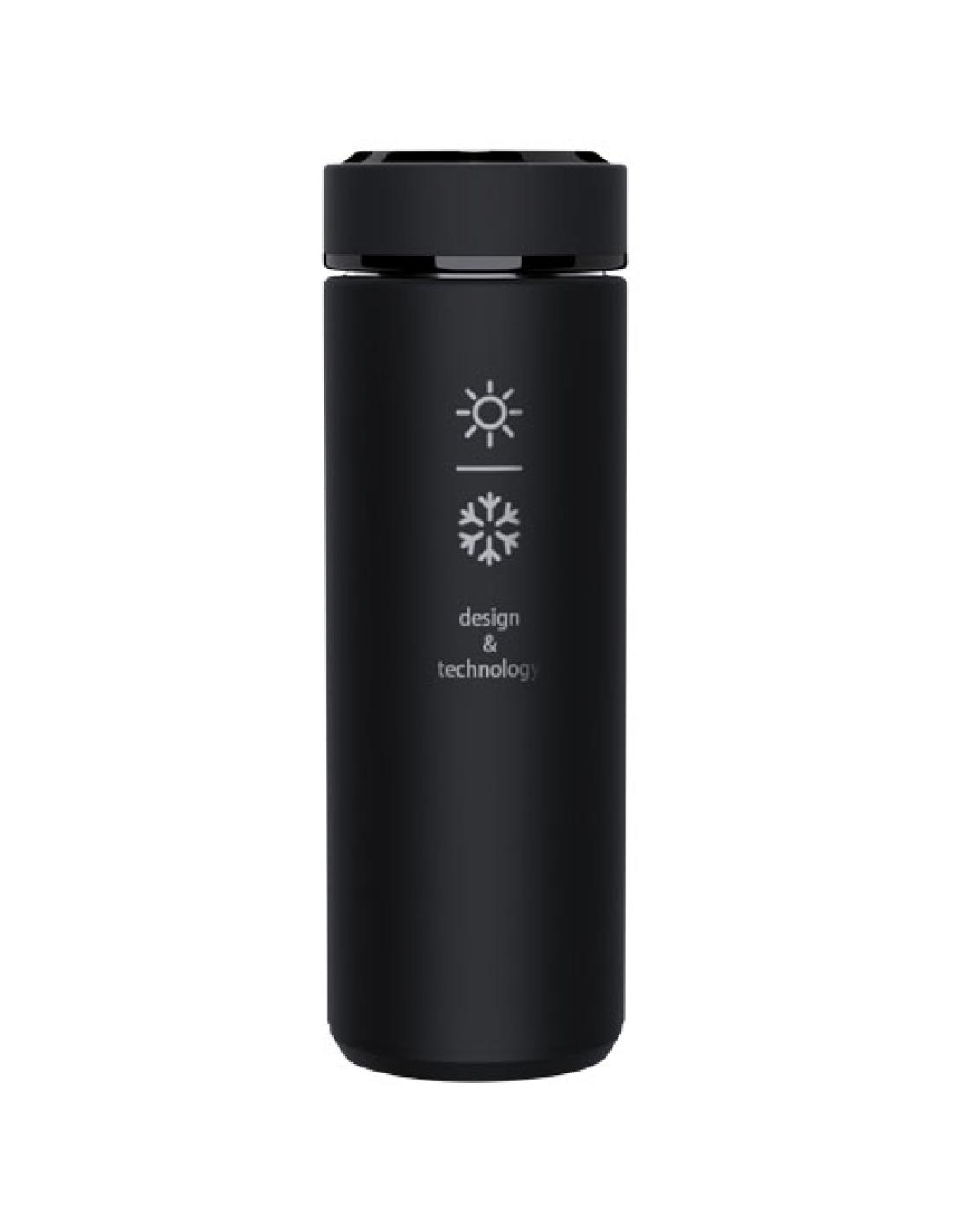 Botella de 450 ml de acero inoxidable con doble pared aislante y sensor de temperatura. Gracias al sistema «Touch & Light», la temperatura de la bebida se muestra en la tapa de la botella (en ° Celsius). Adecuado tanto para bebidas calientes como frías. Viene en una caja cilíndrica de regalo fabricada con papel reciclado. Tamaño: Ø 47 × 225 mm. Batería incluida: CR 2450 (3 V). La batería no puede sustituirse. Puede mostrar la temperatura 20 000 veces.