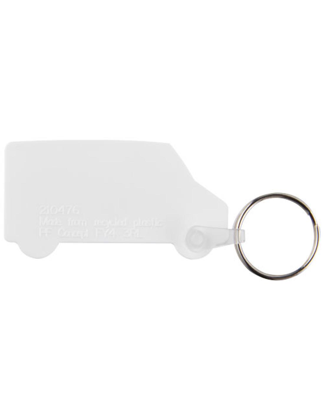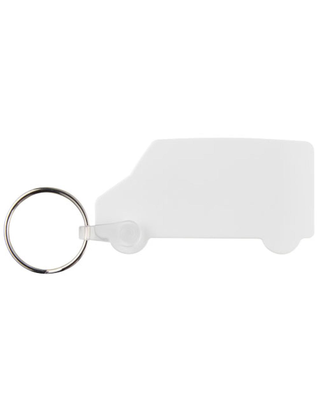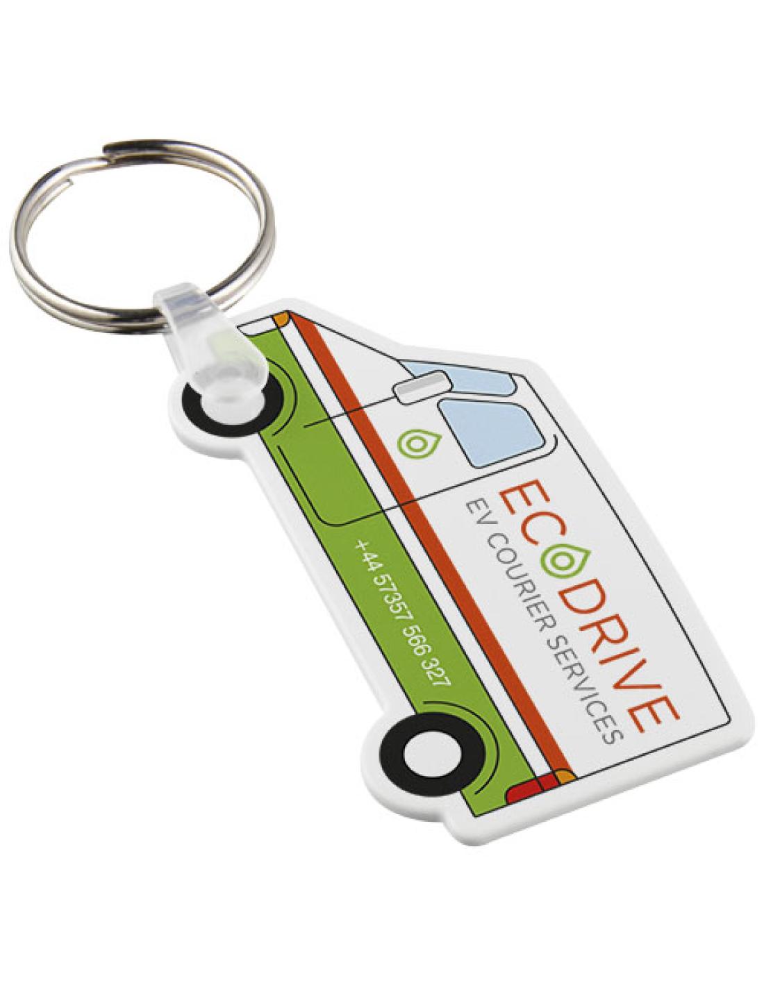 Llavero blanco en forma de furgoneta con anilla abierta de metal. La anilla de metal es de perfil plano, ideal para envíos por correo postal.