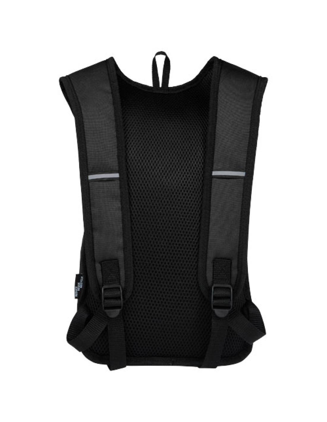 La mochila "Trails", confeccionada con tejido 100 % reciclado GRS y repelente al agua, cuenta con un bolsillo delantero con cremallera, un compartimento principal con cremallera y es compatible con bolsas de hidratación. Tiene franjas reflectantes para una mejor visibilidad y la parte trasera es de malla para mayor comodidad, por lo que es una gran opción sostenible para realizar actividades al aire libre.