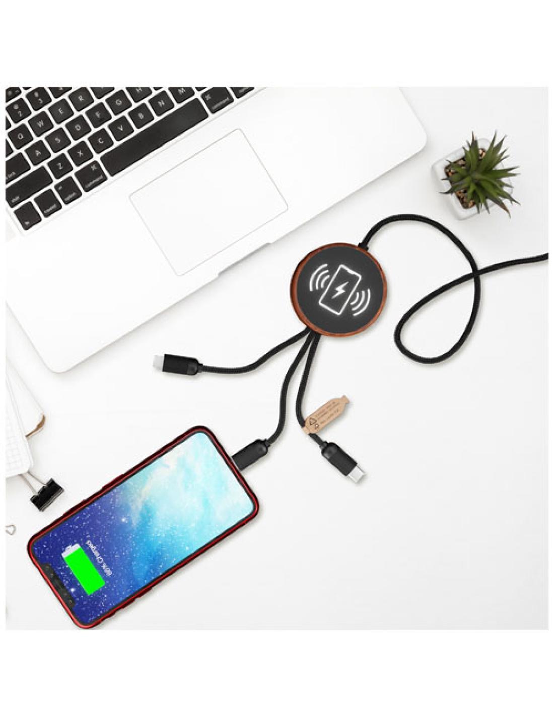 Cable de carga 5 en 1 de PET reciclado con logo retroiluminado y base de carga de bambú de 10 W. Cuenta con 3 conectores (tipo C, micro USB, iPhone) y un conector USB doble para uso universal. Se entrega en una funda de TPU, con una tarjeta de papel kraft. Longitud del cable: 1 metro. Incluye una garantía de tres años.
