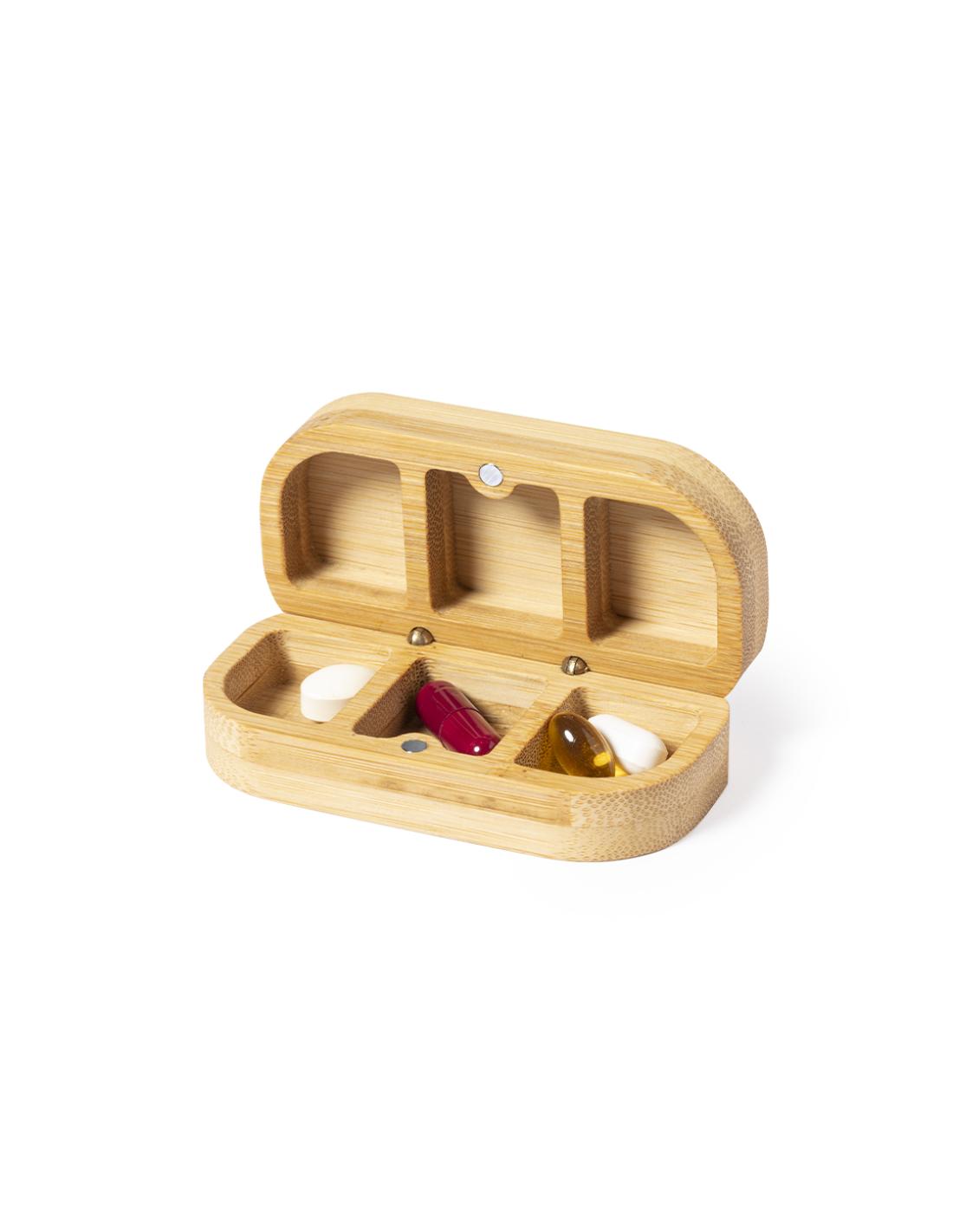 Pastillero de línea nature fabricado en bambú. Con 3 compartimentos interiores y cierre magnético.