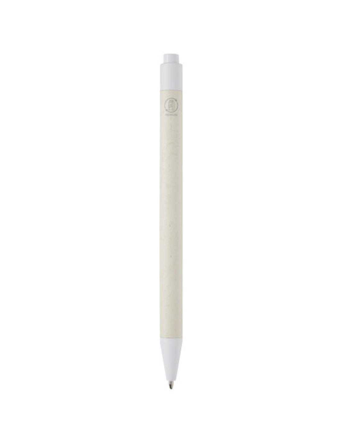 Bolígrafo con mecanismo de presión y cuerpo fabricado con cartones de leche reciclados (hasta un 70 %). El botón, la pinza y la punta están hechos de plástico PLA. Los cartones de leche usados se recogen, clasifican, procesan y convierten en papel, por lo que los residuos se transforman en un producto útil.