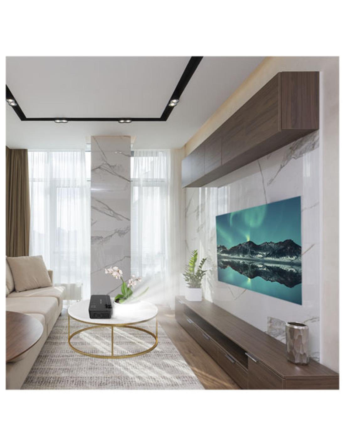 Proyector con una resolución de 800 x 480 y una distancia de proyección de hasta 5 metros. Lámpara con una potencia de hasta 2800 lúmenes. Luz LED blanca de 40 lúmenes ANSI. Contraste 500:1. Bombilla LED con más de 50 000 horas de reproducción. Proyección de 76 a 381 cm. Puede conectarse a todo tipo de dispositivos con conexión HDMI. Reproducción de vídeo, audio, fotos y texto. Entradas: VGA, 2 HDMI, USB 2.0, tarjeta Micro-SD y AV IN. Incluye 2 altavoces estéreo y mando a distancia. Se entrega en una lujosa caja de regalo.