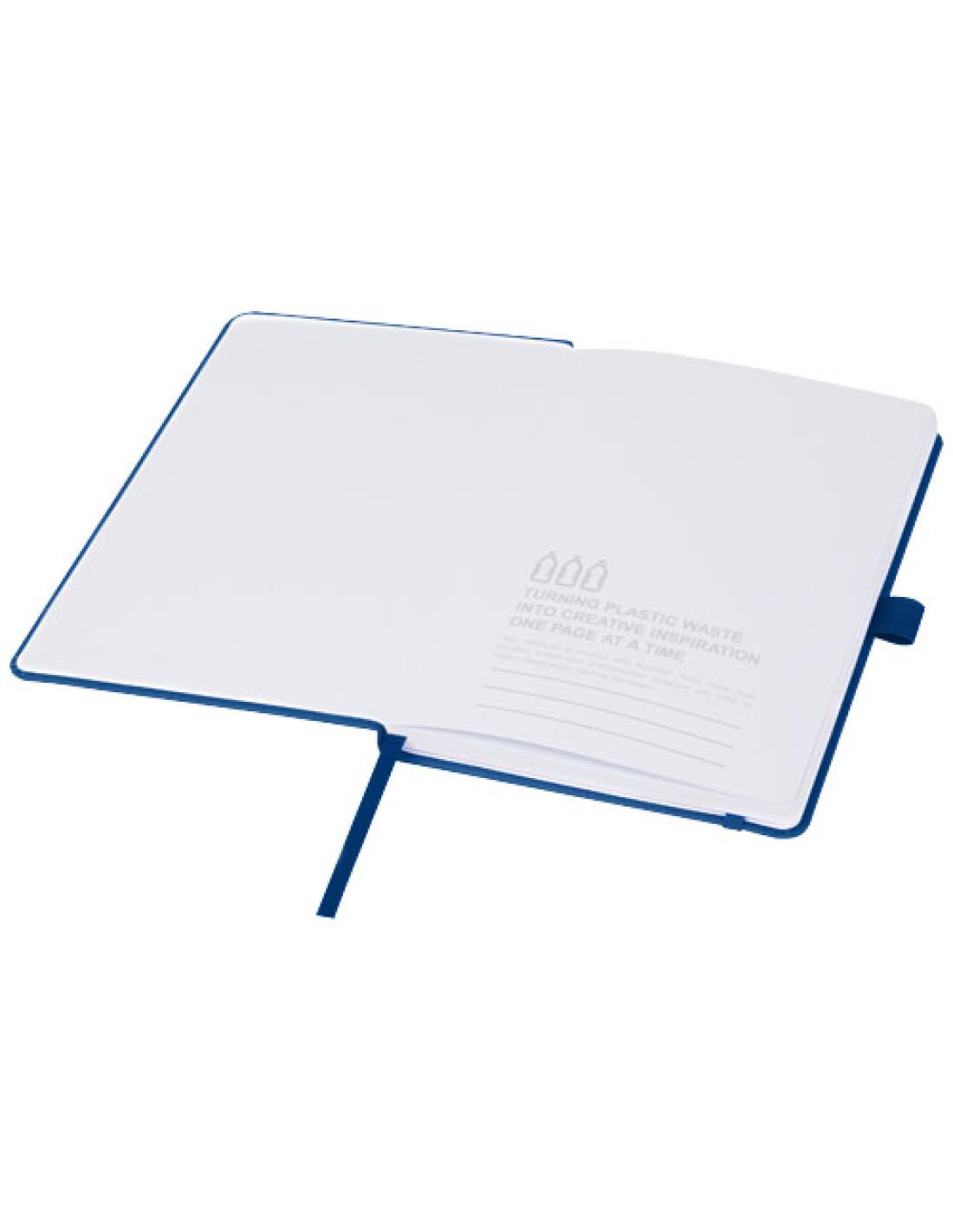 La libreta Thalaasa tiene una tapa de poliéster fabricada con plástico que ha sido recolectado en la costa. Esto hace que sea una opción más sostenible, ya que contribuye a reducir los residuos plásticos. Incluye 80 hojas con líneas de papel reciclado de 80 g/m2, portabolígrafos, cierre elástico, marcapáginas y bolsillo en acordeón.