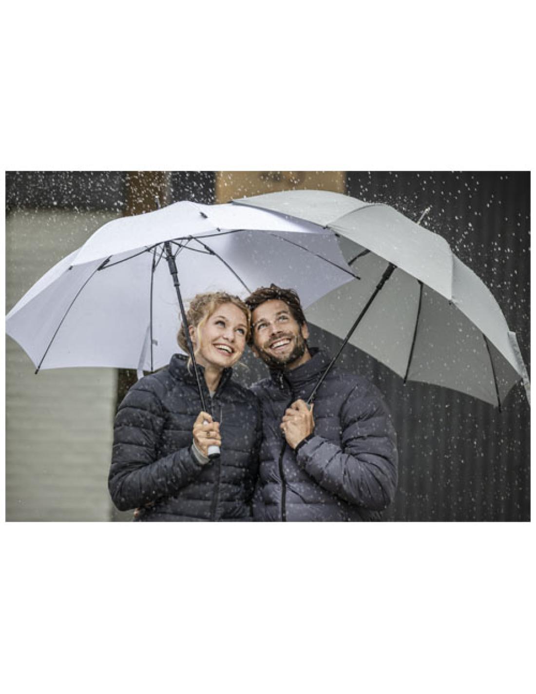 Paraguas de 23" de apertura automática con capa externa de poliéster de tafetán de tereftalato de polietileno reciclado. Tiene un resistente eje de metal, una estructura de fibra de vidrio y una cómoda empuñadura de EVA con el extremo en color a juego. Amplia zona de impresión en cada uno de los paneles.