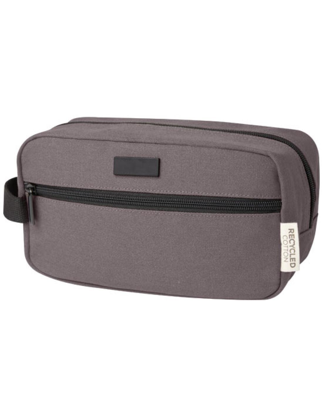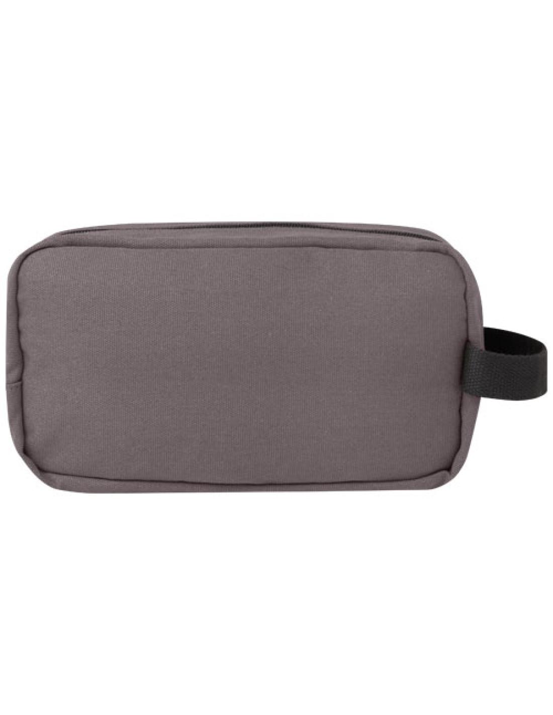 Neceser de viaje de lona reciclada con certificado GRS y forro de RPET con certificado GRS. Cuenta con un bolsillo delantero con cremallera y un compartimento principal con cremallera, bolsillos organizadores y una cómoda correa. La placa metálica decorativa puede hacer brillar un logotipo gracias a su acabado sutil y mate. Capacidad: 3,5 litros.