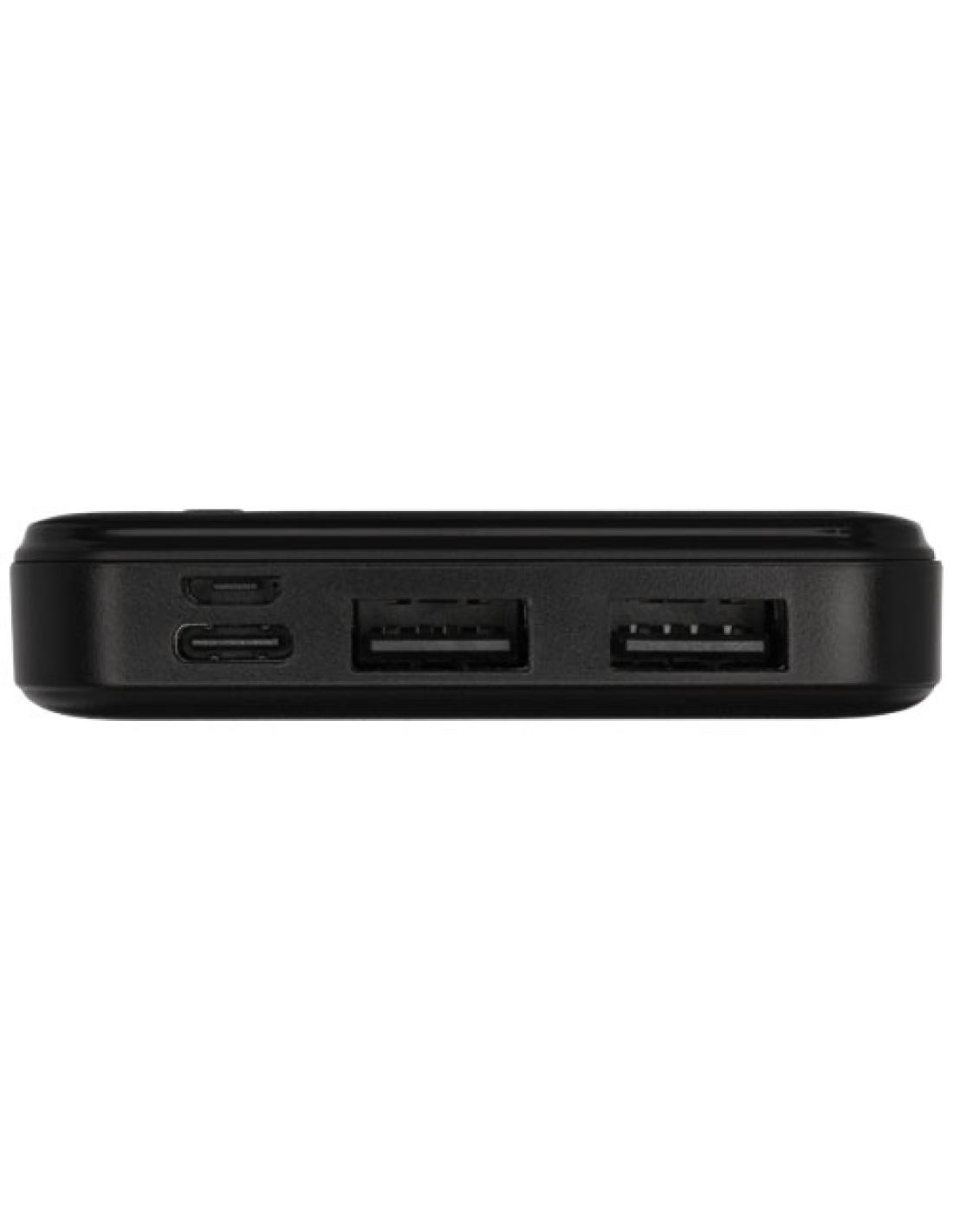 Batería externa fabricada en plástico ABS reciclado. La fuente de alimentación contiene una batería de polímero de litio de grado A 10.000 mAh de larga duración para una carga más rápida. Los indicadores de potencia indicarán el nivel de energía restante para que siempre sepas cuándo hay que recargar. Entrada Type-C 5V/2A, entrada Micro USB 5V/2A, salida dual USB-A 5V/2A, potencia total 10W. Se entrega con un cable de carga de TPE 2A USB-A a Type-C de 30 cm, un manual de instrucciones y una caja de regalo de papel kraft.
