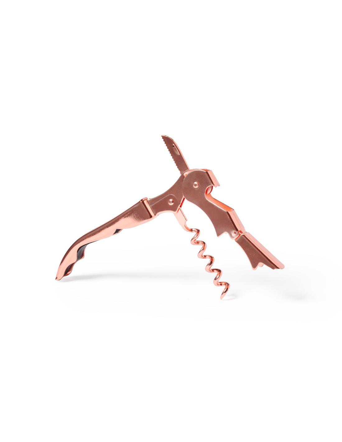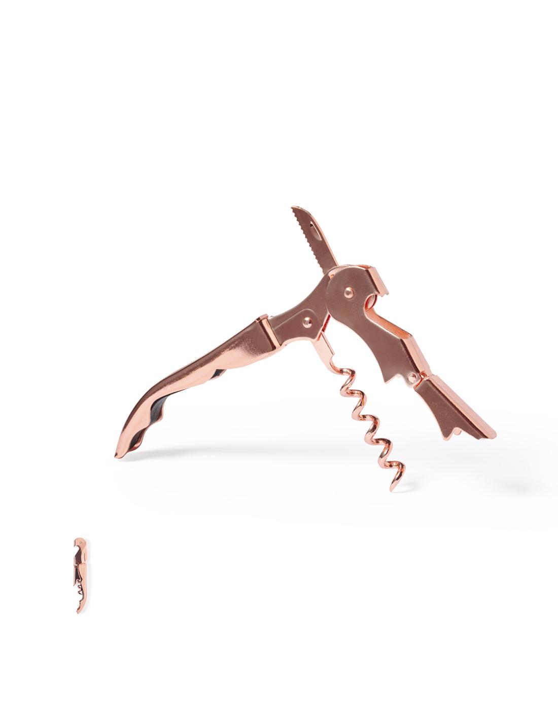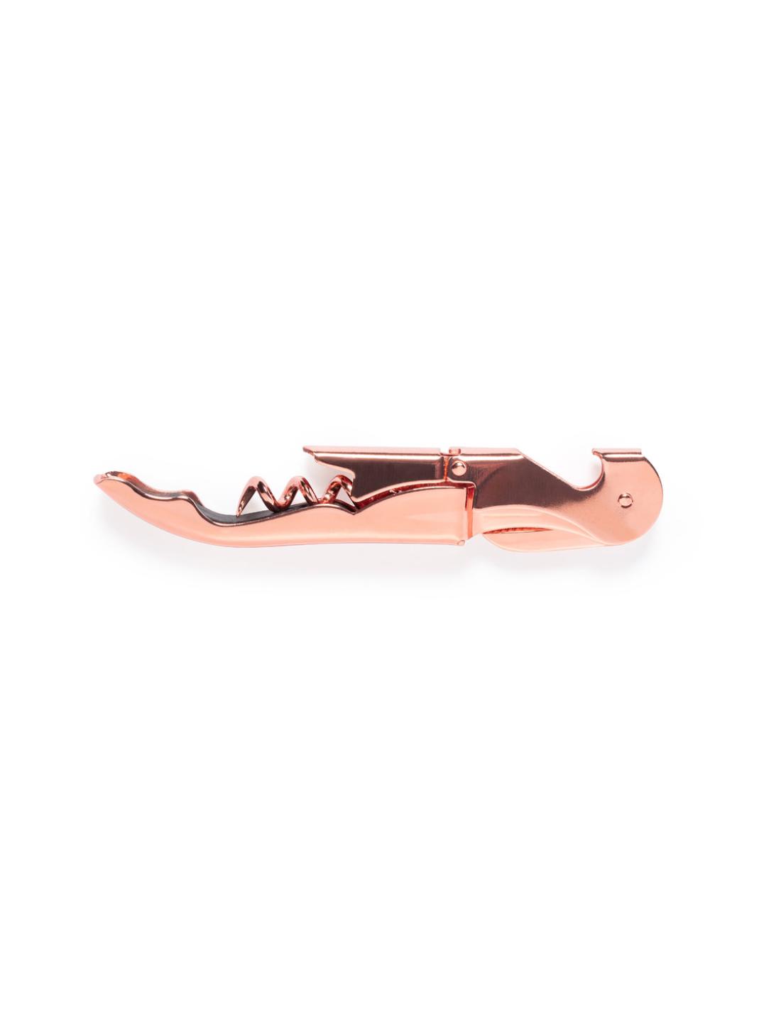 Sacacorchos de 2 tiempos fabricado en acero inox, con recubrimiento exterior en cobre galvanizado. Cortacápsulas integrado y presentado en caja individual de diseño.