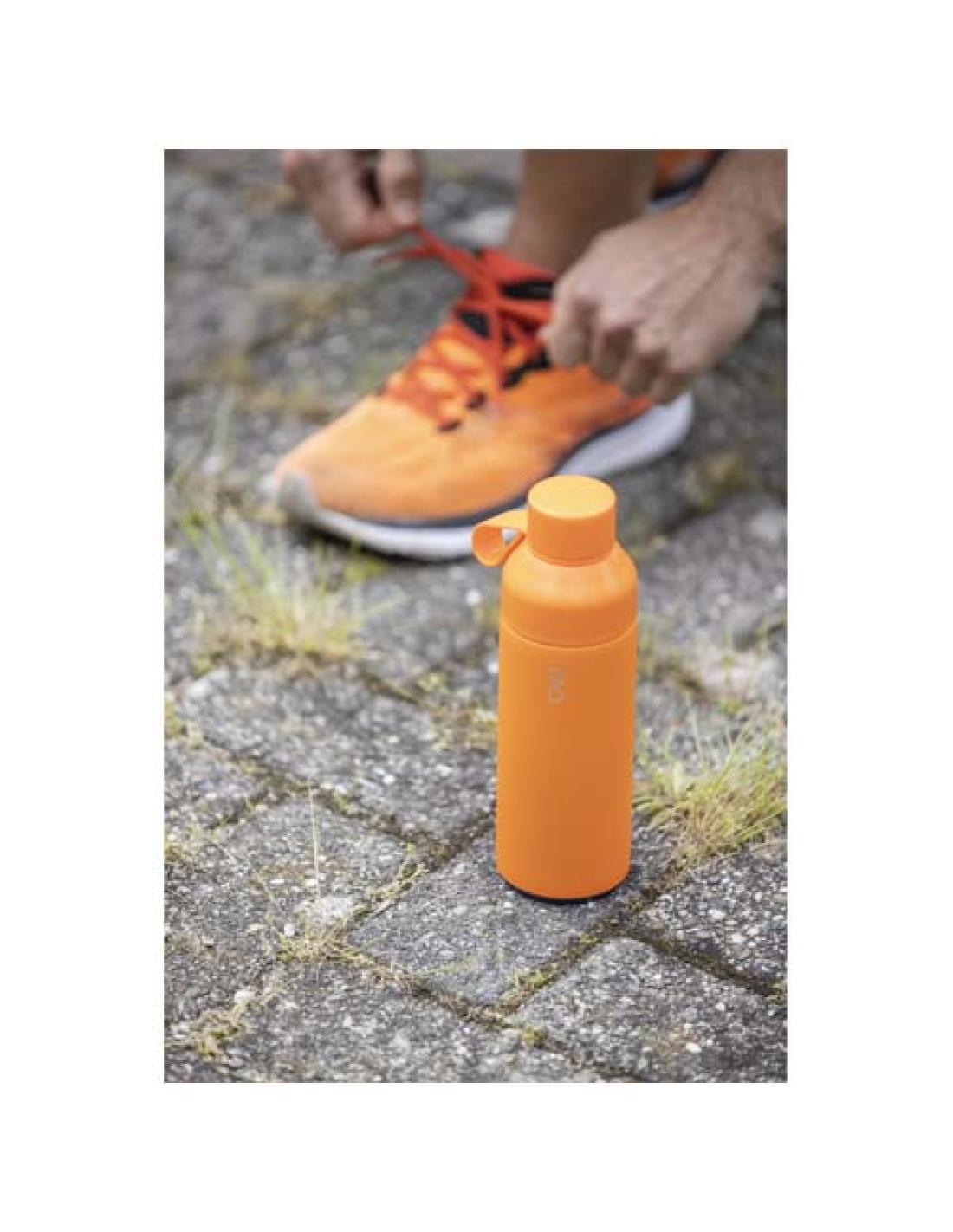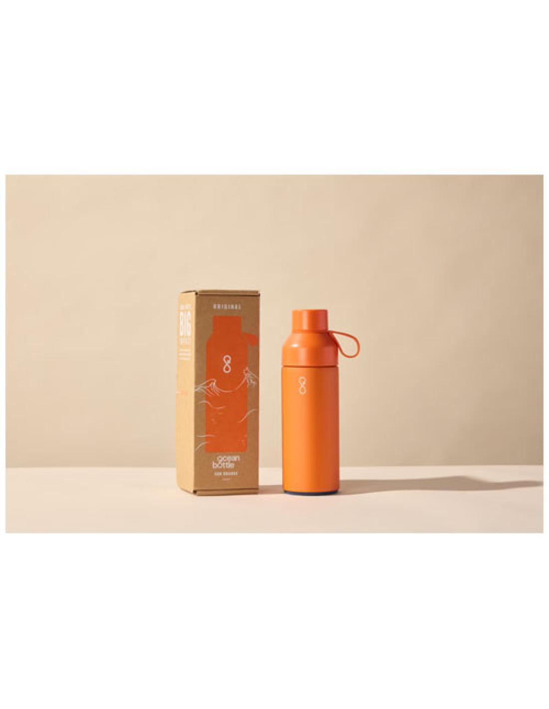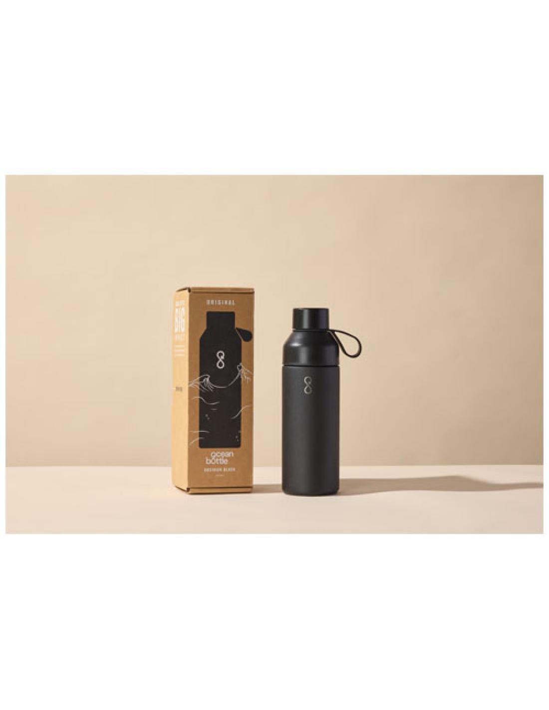 La botella "Ocean Bottle" de 500 ml tiene aislamiento al vacío para mantener las bebidas calientes durante ocho horas y frías durante dieciocho. Cada "Ocean Bottle" es totalmente neutra en carbono y permite la recogida de 1000 botellas de plástico para mejorar los medios de vida en las comunidades costeras. Contiene acero inoxidable reciclado y plástico reciclado con riesgo de acabar en el océano. Cuenta con un chip inteligente NFC para la recolección de plástico cada vez que se rellena. La doble abertura hace que sea fácil de limpiar y llenar, y la tapa antifugas tiene un asa para transportarla fácilmente. La botella es apta para el lavavajillas y no contiene BPA. Presentada en una caja de regalo de cartón reciclado de origen responsable.