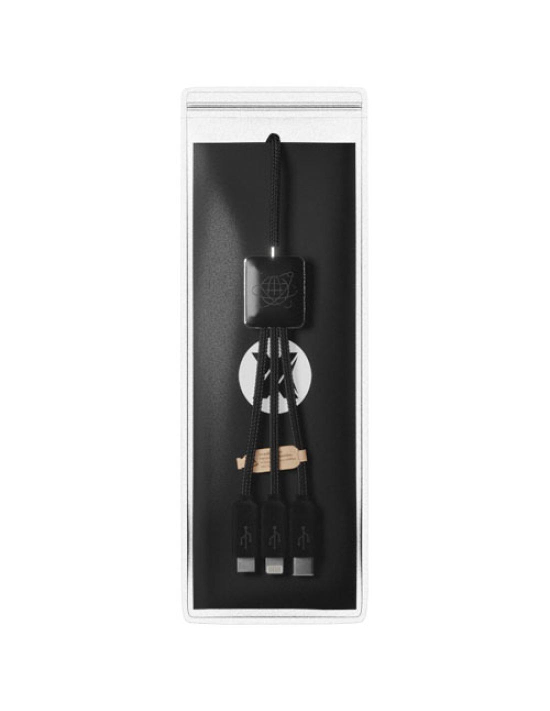 Cable de carga y transferencia de datos 5 en 1 en PET reciclado con logo retroiluminado y estuche cuadrado de plástico. El logotipo retroiluminado es visible por ambos lados. Cuenta con 3 conectores (tipo C, micro-USB, iPhone) y un conector USB doble para uso universal. El cable permite la transferencia de datos en cada uno de los extremos y para cualquier tipo de dispositivo (USB C + Lightning + micro-USB). Se entrega en una funda de TPU, con una tarjeta de papel kraft. Longitud del cable: 1 metro. Incluye una garantía de tres años.
