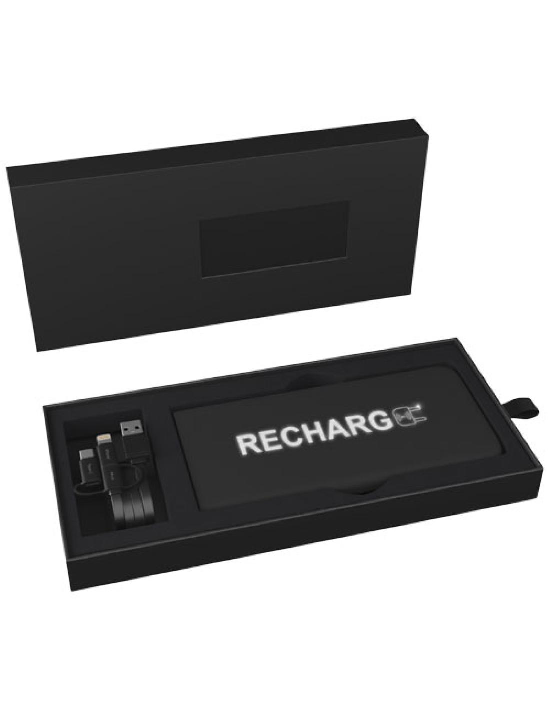Batería externa con logotipo retroiluminado de goma ultradelgado y ultraligero con un cable PET de plástico reciclado 5 en 1. El dispositivo se enciende cuando se toca debido a su «función de activación por agitación», y el logotipo puede permanecer encendido hasta 20 días sin recargarse la batería. Capacidad: 5000 mAh. Salida CC dual: 5 V/2 A y 5 V/2 A de carga rápida. Entrada de CC: microUSB de 5 V/2 A. Peso neto: 110 gramos. Tamaño: 138 × 66 × 8,5 mm. Viene con una caja de regalo fabricada con papel reciclado.