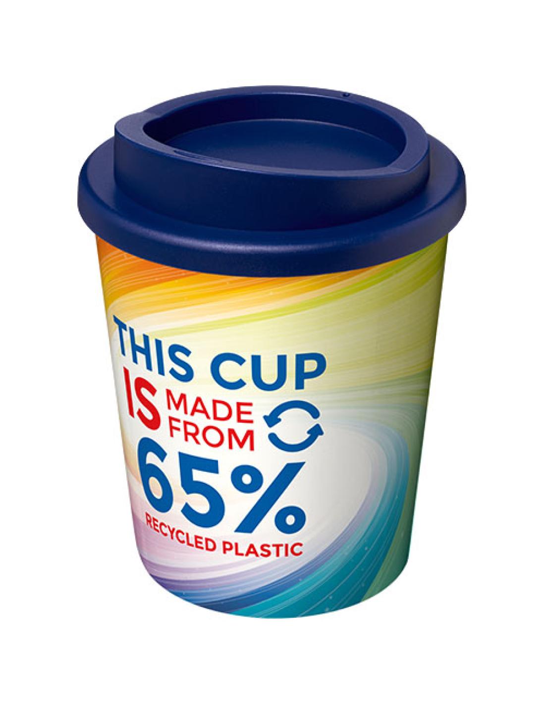 Vaso con aislamiento de doble capa, tapa enroscable y diseño envolvente a todo color moldeado en el producto. El vaso está fabricado con un 65% de materiales reciclados (taza reciclada e interior negro) y tiene una tapa de plástico estándar. La taza es totalmente reciclable y apta para lavavajillas y microondas. Capacidad: 250 ml. Sin BPA. Empaquetada en una bolsa de material compostable. Fabricada en el Reino Unido.
