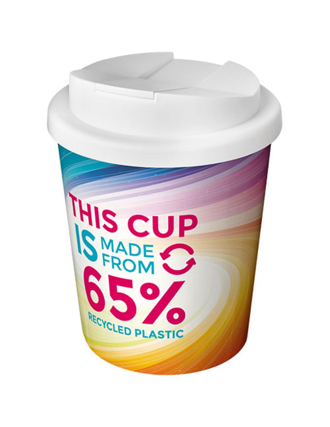 Vaso con aislamiento de doble capa, tapa enroscable a prueba de derrames y diseño envolvente a todo color moldeado en el producto. El vaso está fabricado con un 65% de materiales reciclados (taza reciclada e interior negro) y tiene una tapa de plástico estándar. La taza es totalmente reciclable y apta para lavavajillas y microondas. Capacidad: 250 ml. Sin BPA. Empaquetada en una bolsa de material compostable. Fabricada en el Reino Unido.