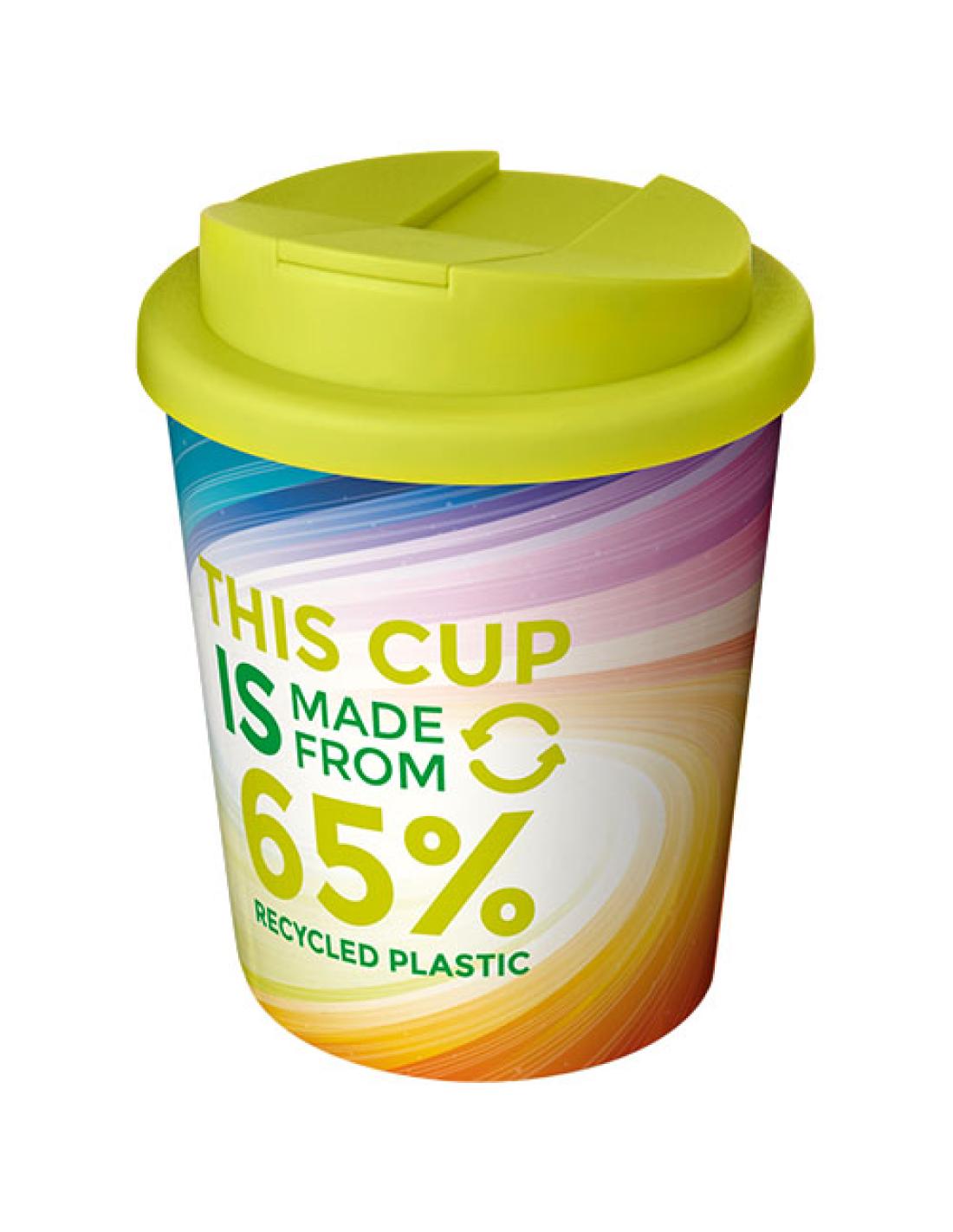 Vaso con aislamiento de doble capa, tapa enroscable a prueba de derrames y diseño envolvente a todo color moldeado en el producto. El vaso está fabricado con un 65% de materiales reciclados (taza reciclada e interior negro) y tiene una tapa de plástico estándar. La taza es totalmente reciclable y apta para lavavajillas y microondas. Capacidad: 250 ml. Sin BPA. Empaquetada en una bolsa de material compostable. Fabricada en el Reino Unido.
