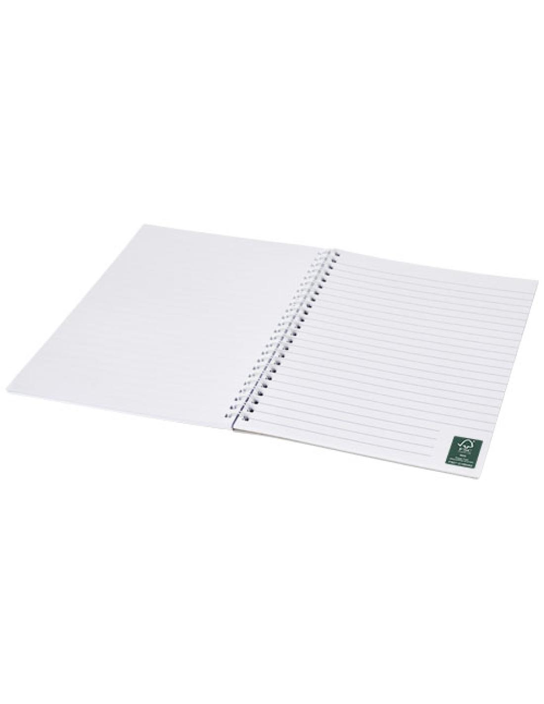Esta libreta A5 incluye una espiral blanco o negro, papel en blanco de 80 g/m2 y una cubierta frontal y posterior brillante (250 g/m2). El modelo estándar se entrega con 50 hojas, pero la libreta también está disponible con 80 hojas. Es posible imprimir las hojas, así como las cubiertas delantera y trasera.