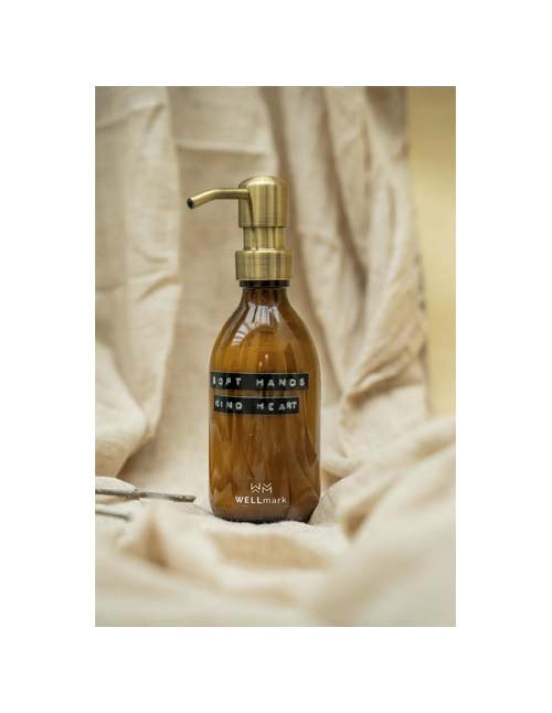 Elegante dispensador de cristal (250 ml) para el cuarto de baño o la cocina. Este elegante dispensador lleva crema de manos vegana con un agradable aroma a bambú que limpia y cuida tus manos. El atractivo cristal marrón en combinación con la tapa de cobre y el texto "Soft hands kind heart" (Manos suaves, corazón bondadoso) aportan un toque especial a cualquier interior. Una vez terminado, el dispensador puede rellenarse fácilmente. Fabricado en los Países Bajos.