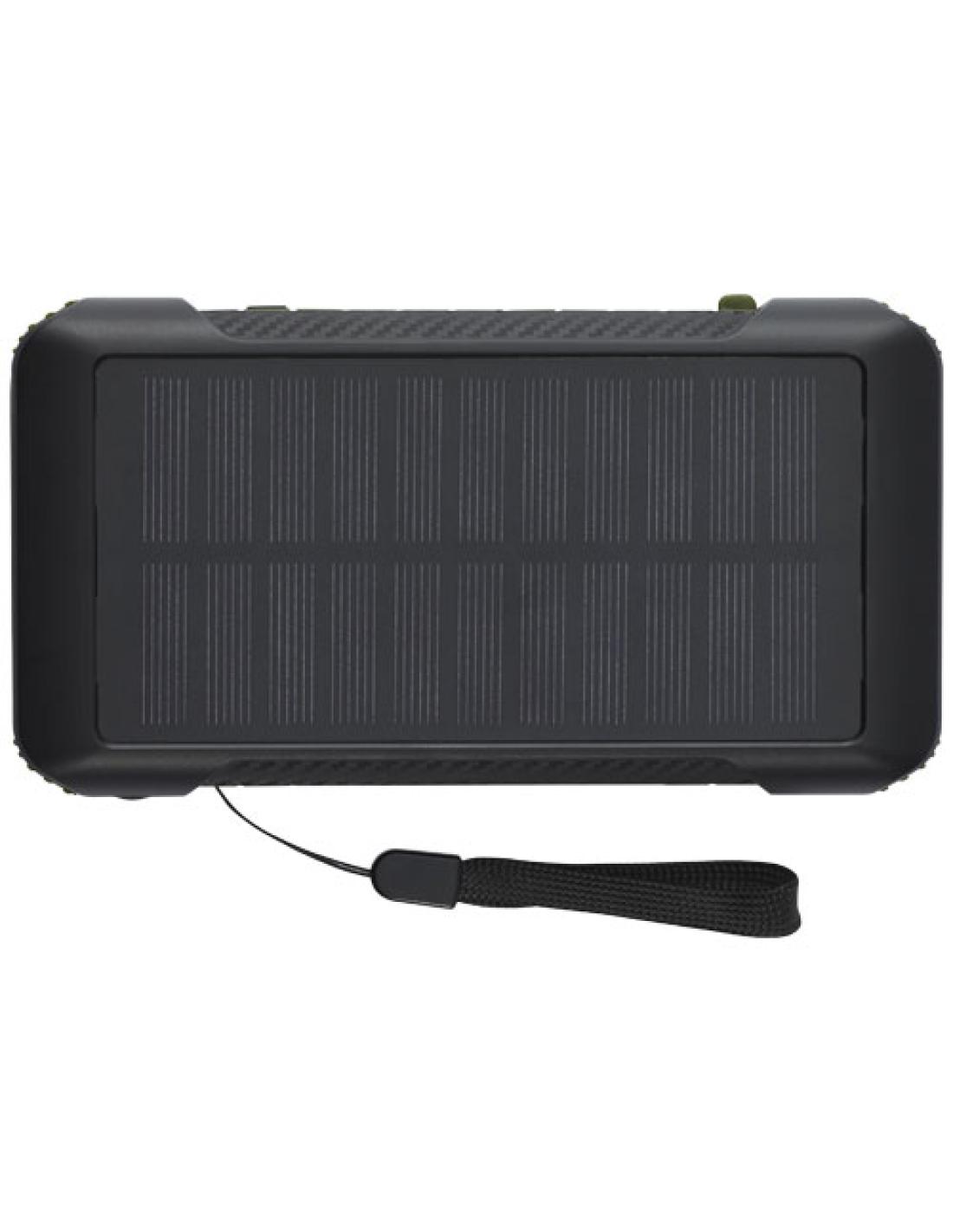 La batería externa solar de plástico reciclado con certificación RCS de 10 000 mAh "Soldy" es la compañera de carga ideal para las actividades al aire libre. Está equipada con una dinamo de manivela para generar energía manualmente en caso de que te quedes sin batería y no haya luz solar. La batería externa también se puede cargar a través del puerto micro USB o tipo C del dispositivo. Gracias a los cables de carga integrados con conectores micro USB, iOS, tipo C y A, esta batería externa permite cargar la mayoría de smartphones, cámaras, baterías externas, auriculares, etc. Tiene una potencia máxima de salida de 2,4 A por puerto. La potencia de entrada está limitada a 2 A. Se entrega con un manual de usuario y un cable de carga USB A a C de 30 cm, y empaquetado en una caja de papel kraft 100 % reciclado.