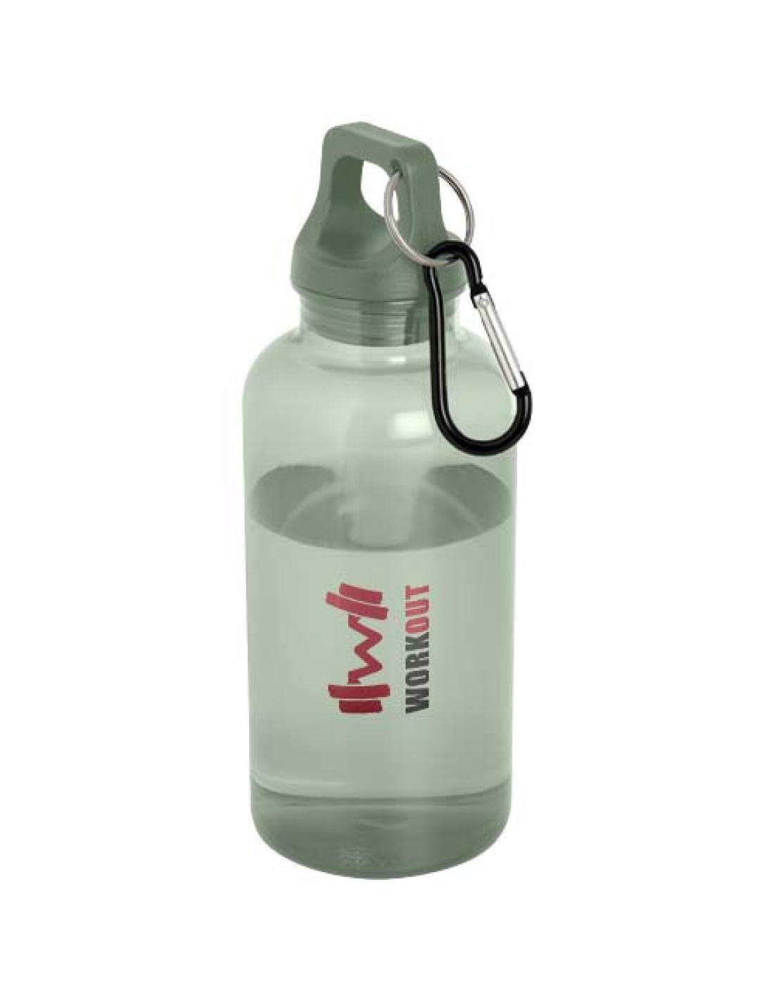 Mantener la hidratación en todo momento es posible con este bidón de 400 ml, resistente y ligero, fabricado con plástico reciclado. Es el compañero perfecto mientras haces ejercicio, en excursiones de un día o en la oficina. El bidón "Oregon" de una sola capa tiene una tapa de rosca y ofrece mucho espacio para añadir cualquier tipo de logotipo. Engancha el mosquetón adjunto (no apto para escalar) de forma segura a una bolsa para evitar perderlo. No contiene BPA y se ha probado y homologado según la legislación alemana sobre seguridad alimentaria (LFGB), y se ha comprobado el contenido de ftalatos según REACH. La tapa y el cuerpo están fabricados con un 100 % de plástico reciclado.