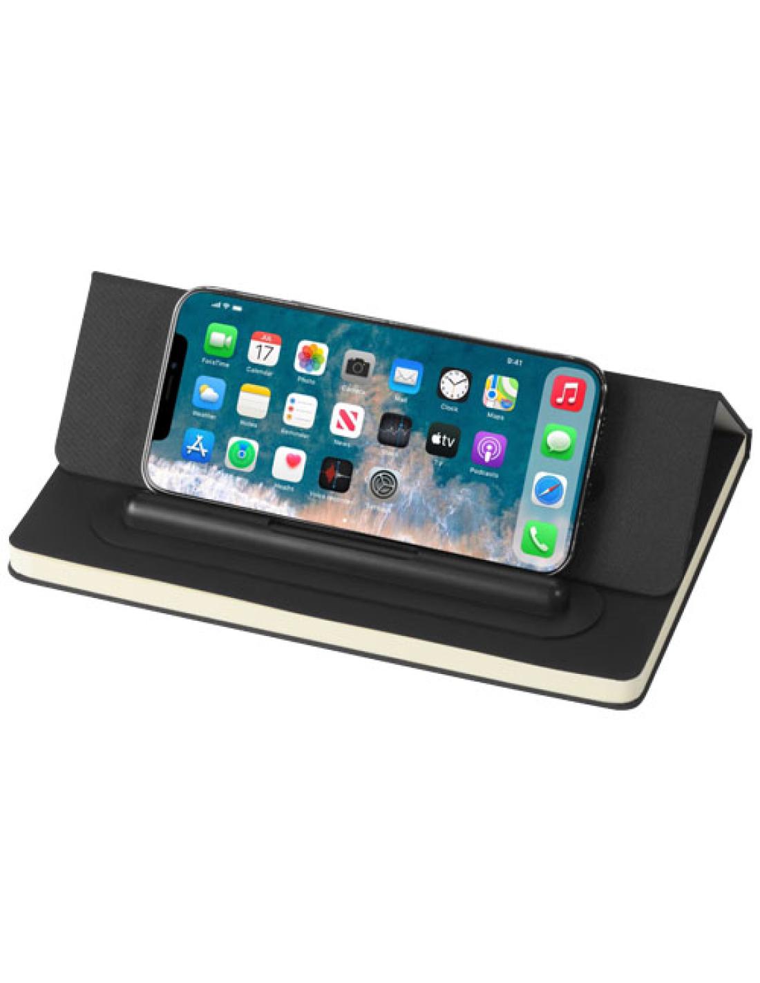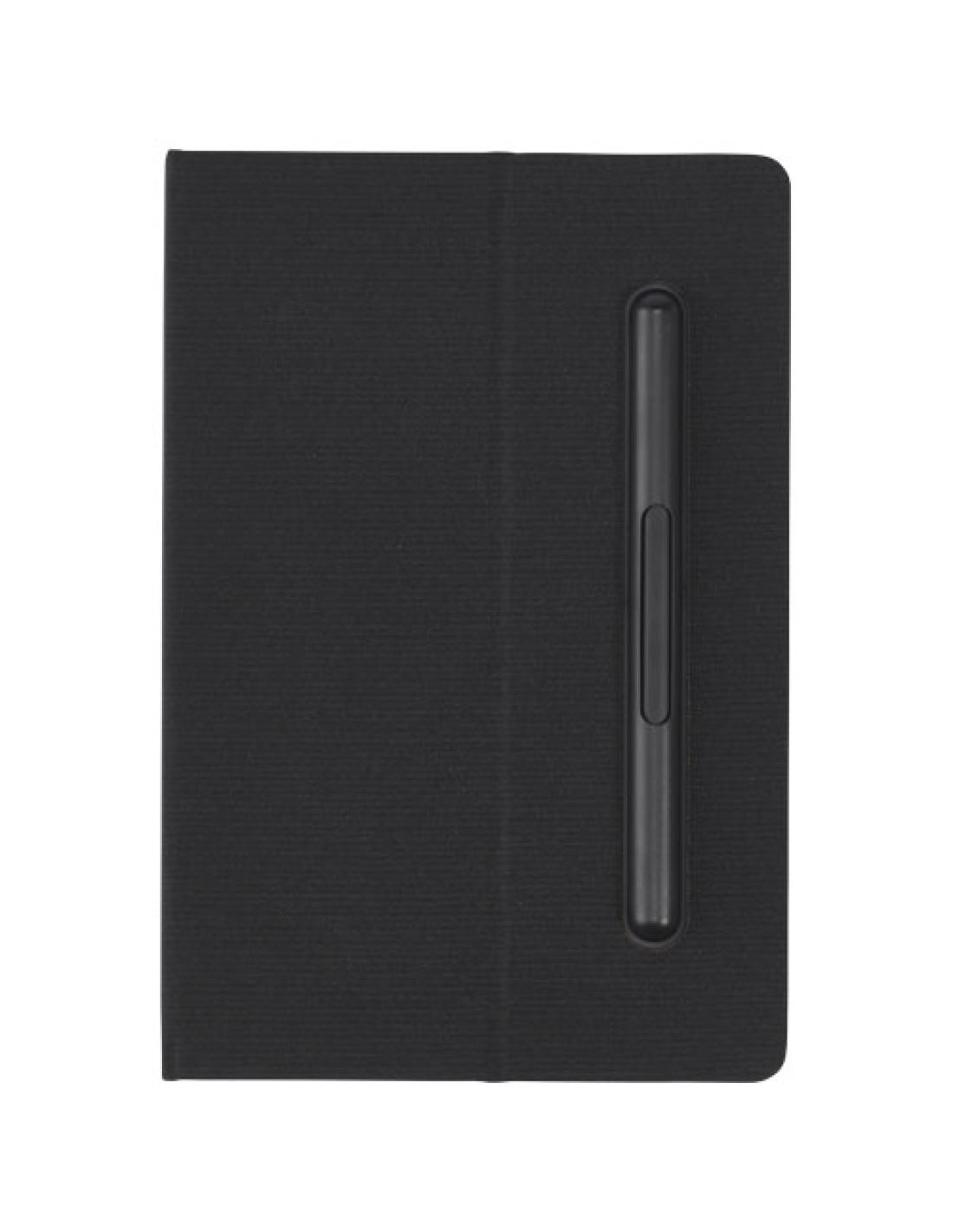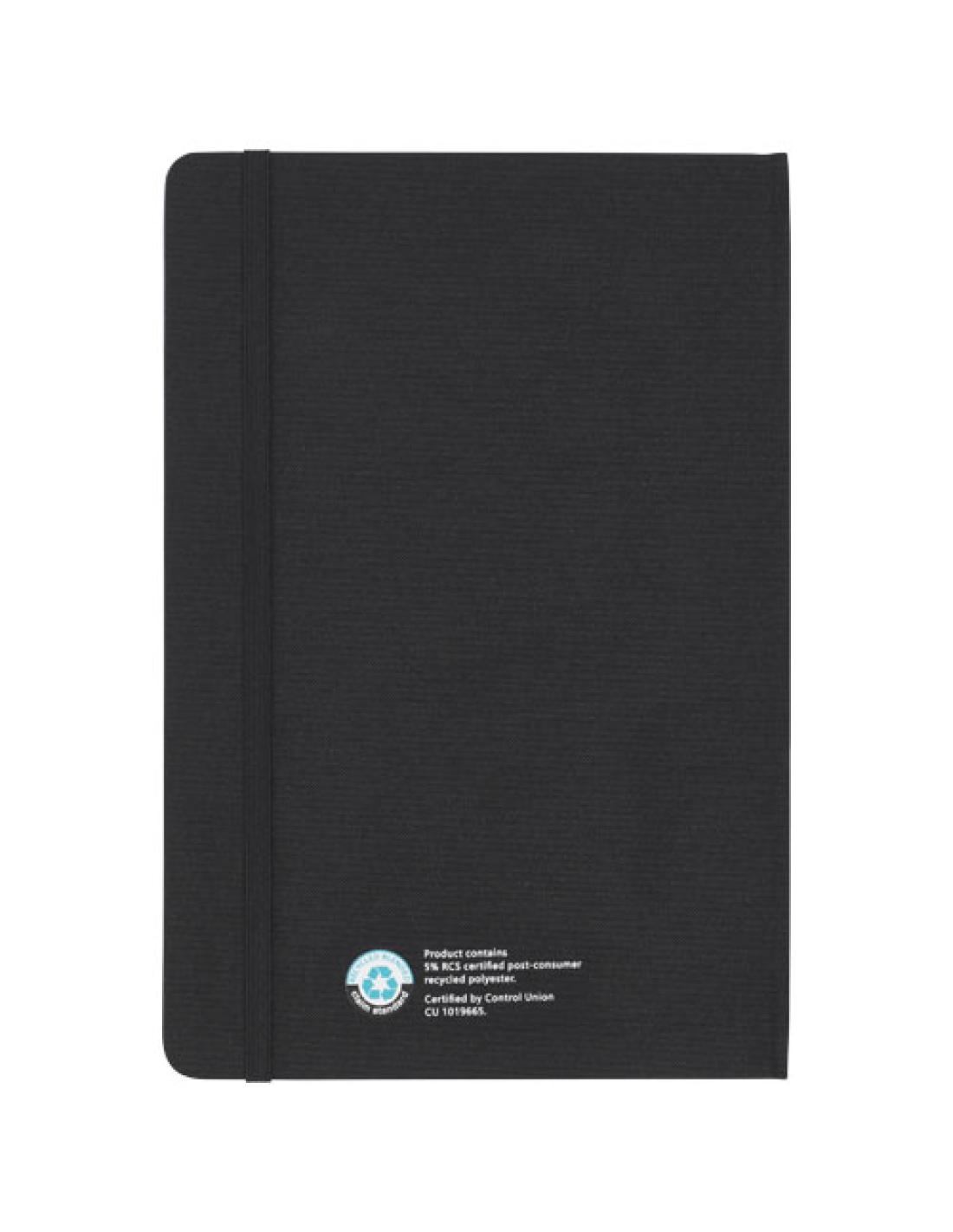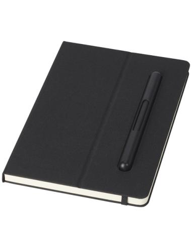 El set de bolígrafo y libreta "Skribo" cuenta con certificación RCS y está parcialmente fabricado con poliéster posconsumo reciclado, por lo que es una opción más sostenible al reducir el uso de materia prima virgen. Dispone de una tapa plegable que lo convierte en un soporte para el móvil. Incluye un bolígrafo de tinta azul y 80 hojas rayadas de papel reciclado de 80 g/m² en color crema procedente de fuentes sostenibles. La longitud de escritura del bolígrafo es de 1000 metros.