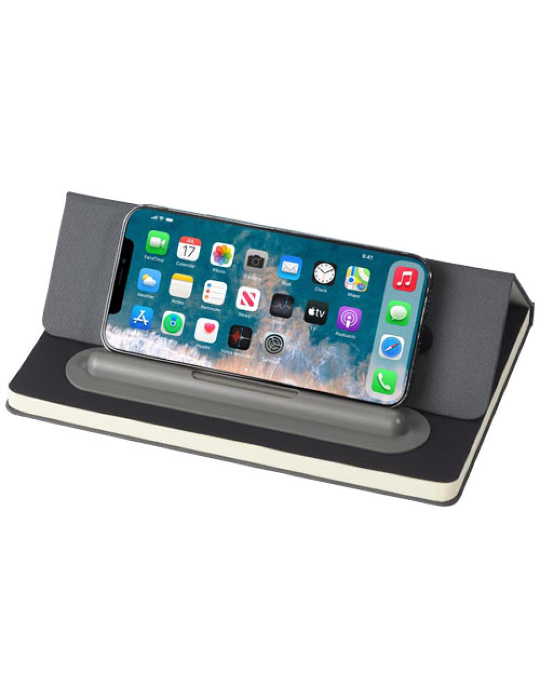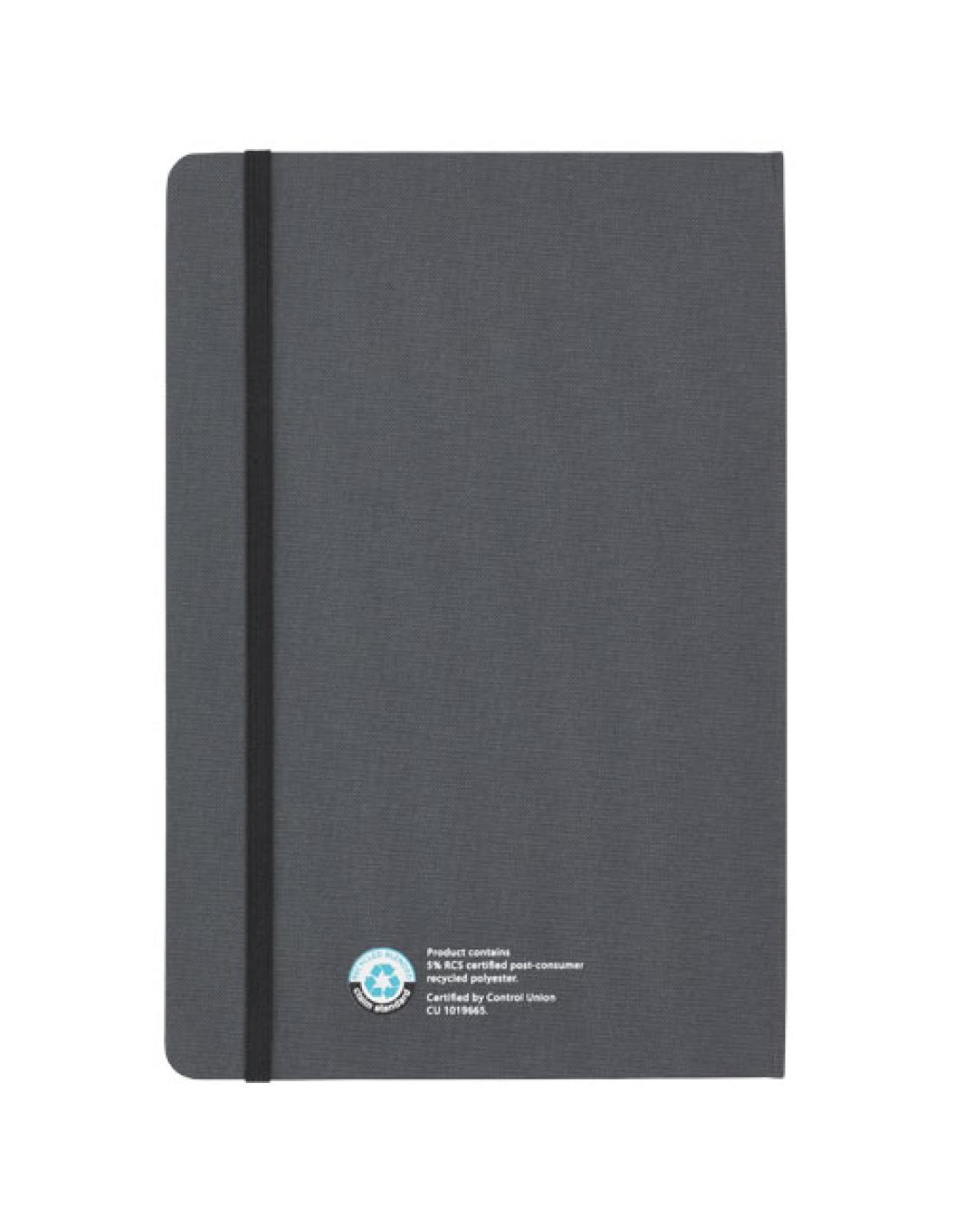 El set de bolígrafo y libreta "Skribo" cuenta con certificación RCS y está parcialmente fabricado con poliéster posconsumo reciclado, por lo que es una opción más sostenible al reducir el uso de materia prima virgen. Dispone de una tapa plegable que lo convierte en un soporte para el móvil. Incluye un bolígrafo de tinta azul y 80 hojas rayadas de papel reciclado de 80 g/m² en color crema procedente de fuentes sostenibles. La longitud de escritura del bolígrafo es de 1000 metros.