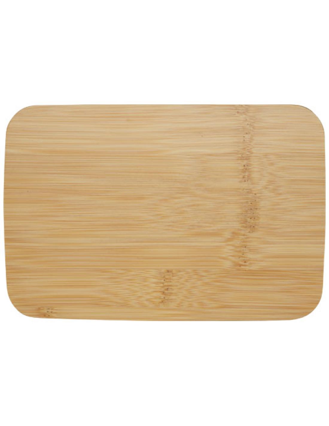 La fiambrera "Mangi" está hecha de plástico reciclado y tiene una capacidad de 750 ml. Cuenta con una tapa de bambú y una banda elástica para mantenerla en su sitio y que el contenido se mantenga fresco. El recipiente se puede lavar en el lavavajillas sin la tapa.