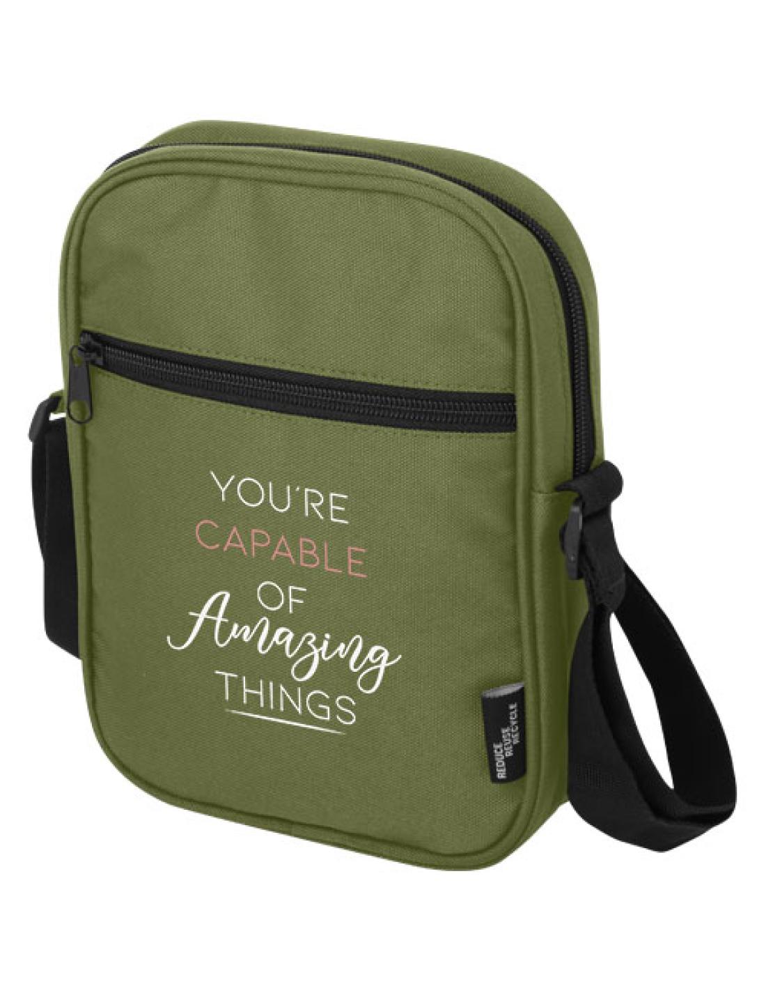 Bandolera práctica y repelente al agua de poliéster reciclado con certificación GRS. Dispone de un compartimento con cremallera con un bolsillo interior para guardar tus dispositivos del día a día, un bolsillo delantero con cremallera para las llaves y los accesorios de valor, y un bolsillo abierto en la parte posterior para un almacenamiento y acceso rápidos. Con sus correas para los hombros ajustables de alta calidad, la bandolera "Byron" es perfecta para el uso diario, con una huella ecológica mínima. Sin PVC.