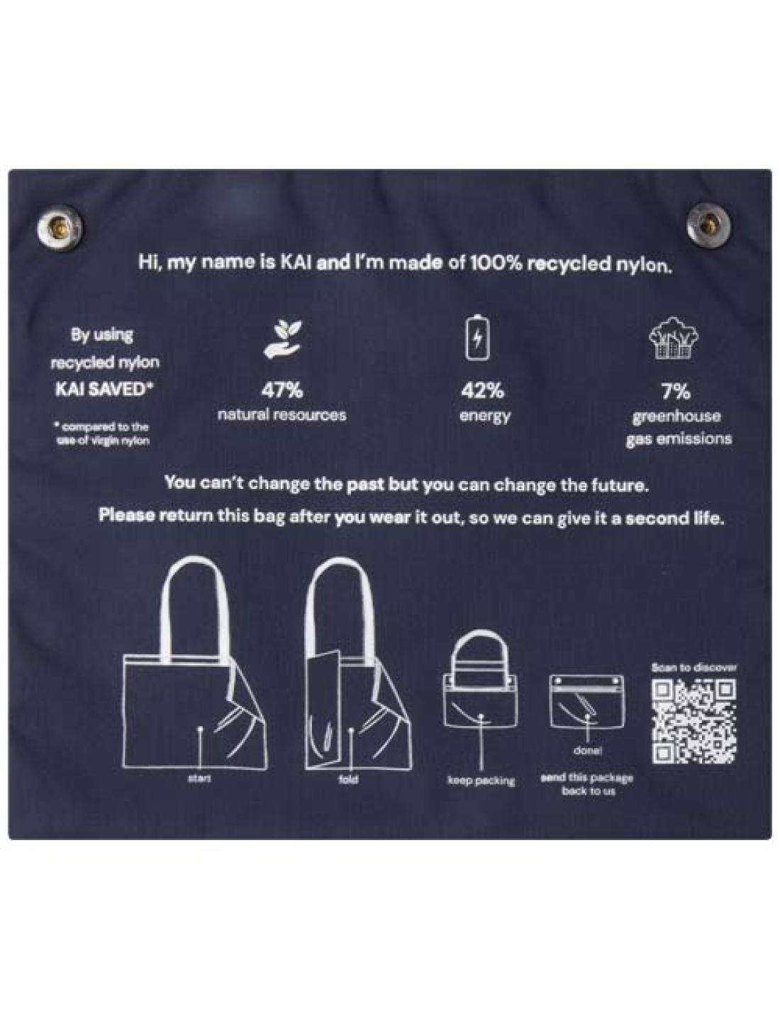 La bolsa Tote "Kai" circular reciclada GRS es la mejor opción en términos medioambientales. Una opción más sostenible empieza por un mejor diseño que tenga menos impacto en el medio ambiente. Solo con 1 bolsa, la reducción media total del impacto es la siguiente: 7 % de huella de carbono, 42 % de energía y 47 % de costes ecológicos. Fabricada con nylon reciclado certificado GRS 200T, la bolsa Tote "Kai" es un modelo clásico y atemporal adecuado para el uso diario. El lugar designado para la impresión es el bolsillo que hace las veces de funda. La bolsa puede devolverse a través de un programa de recogida que incluye un código QR con información adicional.