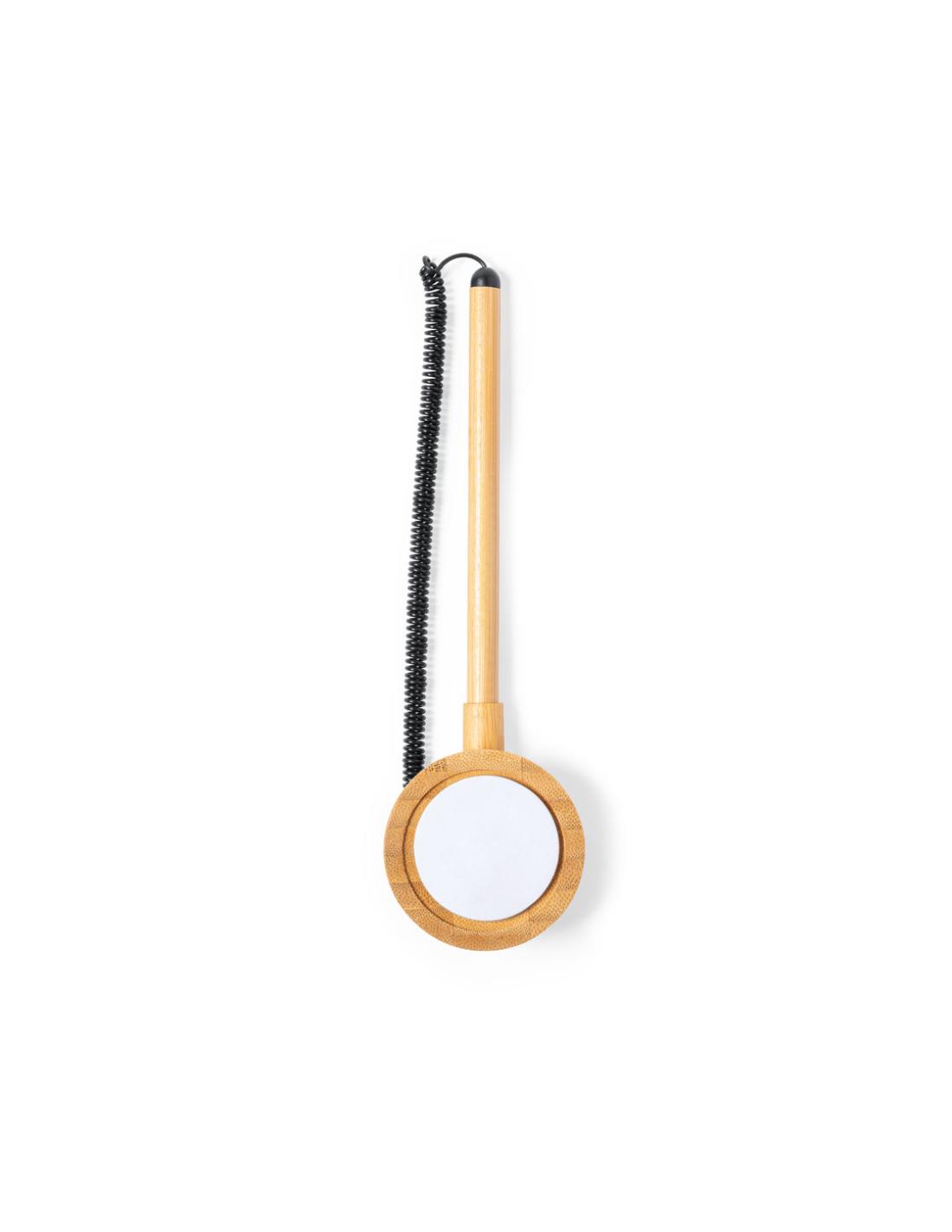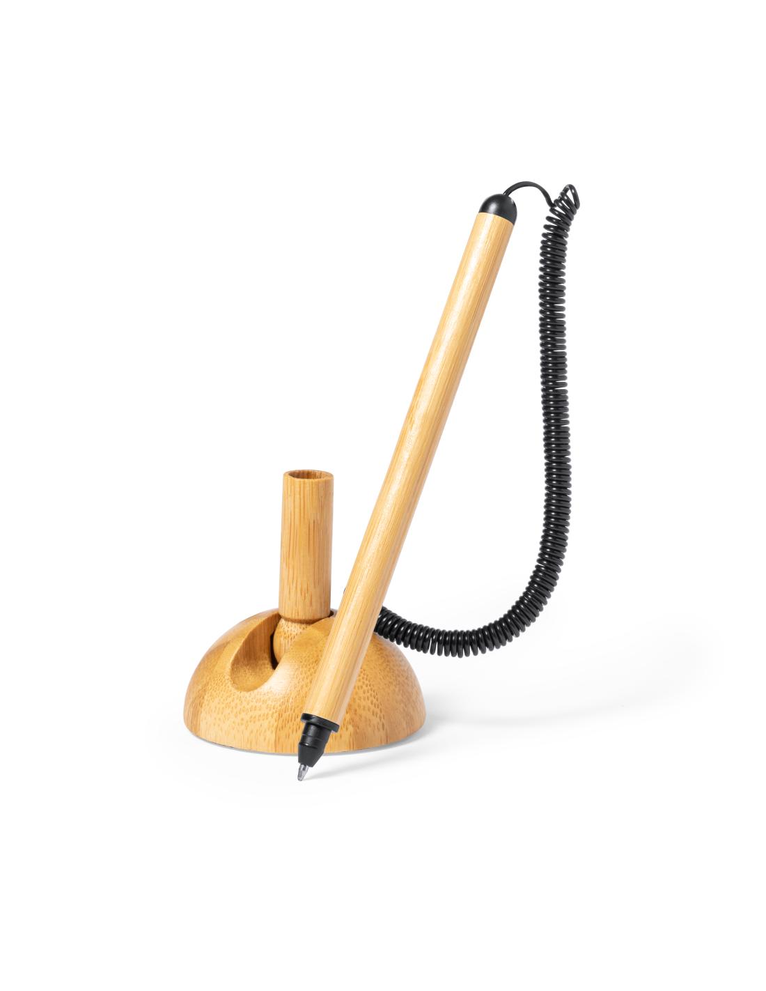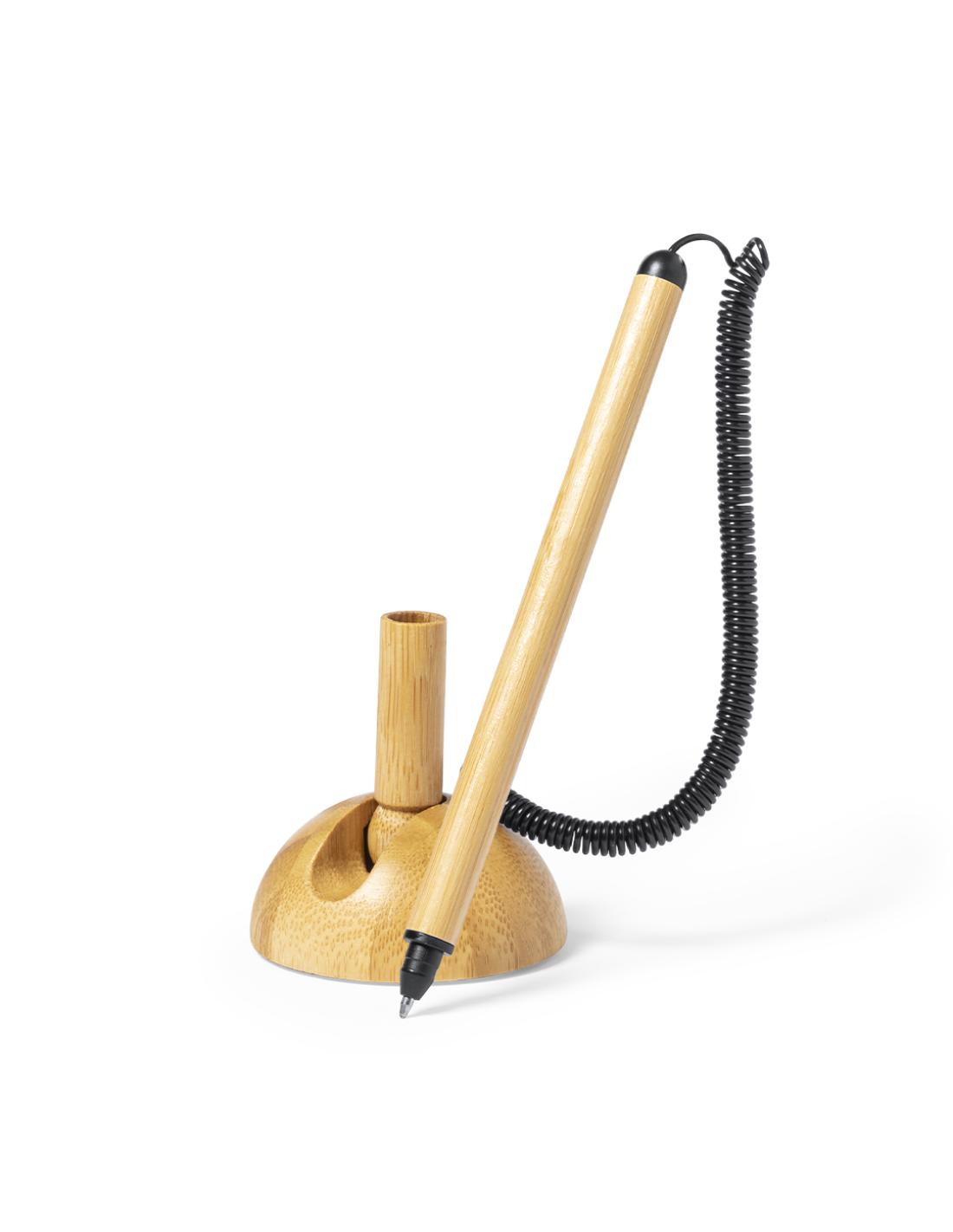 Bolígrafo de línea nature fabricado en bambú, en tinta azul y con cable extensible. Incluye soporte de bambú para el bolígrafo, con adhesivo 3M en la base, fijación extra fuerte y libre de residuos al despegarlo. Presentado en caja individual de diseño kraft.