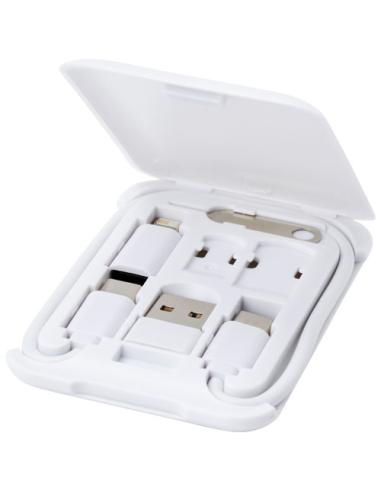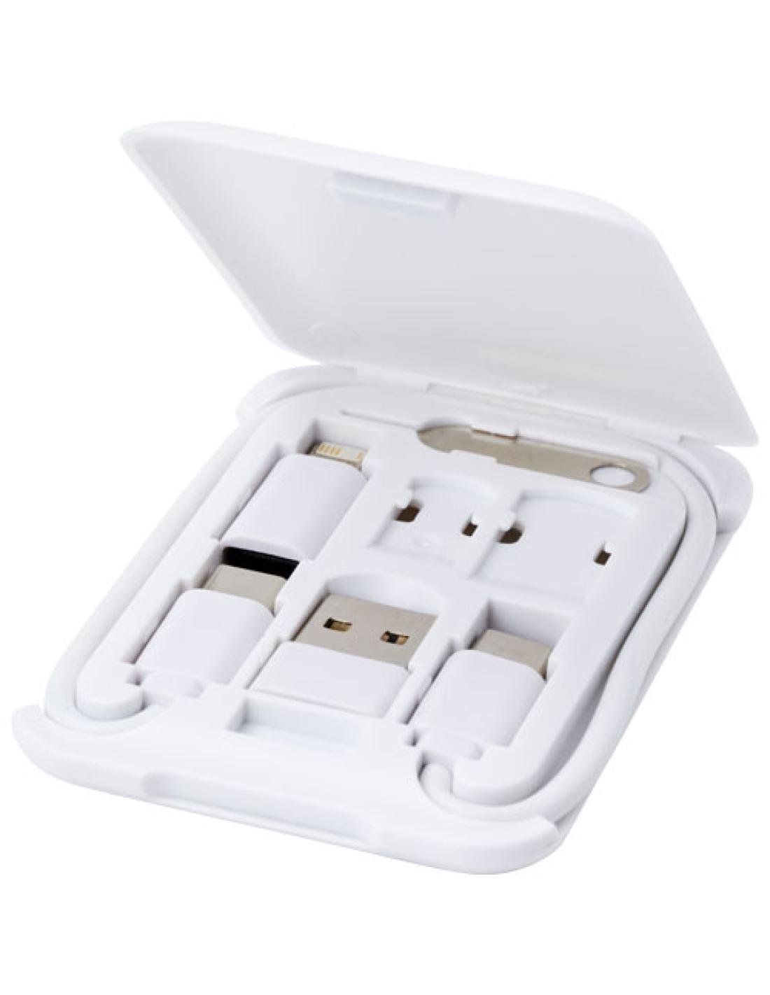 El cable modular de carga y transferencia de datos fabricado con plástico reciclado se entrega en un elegante estuche que también sirve de soporte para el teléfono. El cable ofrece múltiples soluciones de carga: Entrada USB tipo C y A, y salida USB tipo C/iOS/micro. Gracias a todos estos adaptadores y conectores, este cable permite cargar la mayoría de smartphones, cámaras, baterías externas, auriculares, etc. El cable tiene una potencia de salida máxima de 2 A. Dispone de un pasador de expulsión que resulta muy útil para extraer la tarjeta SIM del teléfono. El estuche también tiene espacio para guardar una tarjeta de memoria micro SD, así como una tarjeta nano SIM, lo que lo convierte en el accesorio de viaje perfecto. Longitud del cable: 26 cm. Se entrega en un sobre de papel kraft 100 % reciclado.