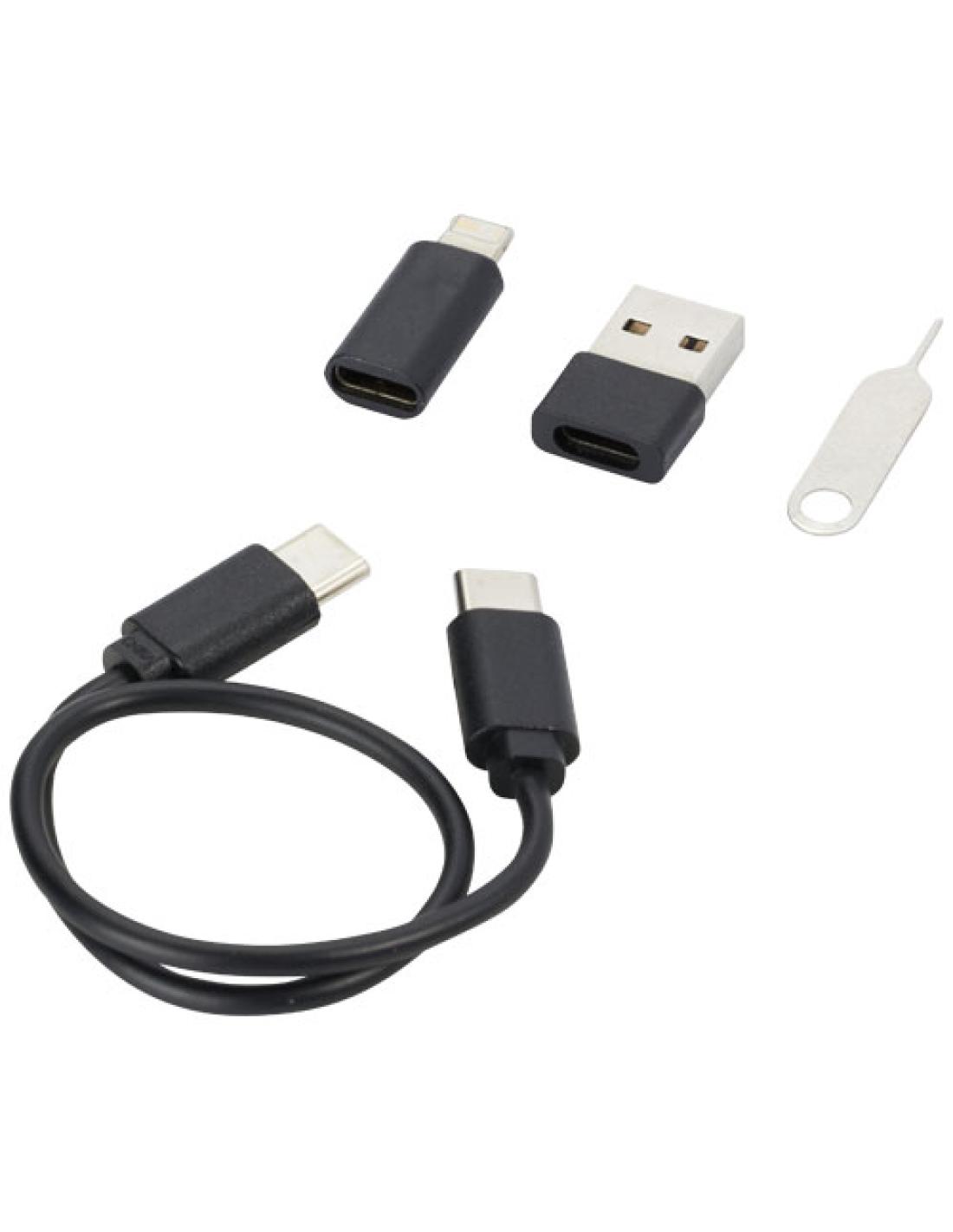 El cable modular de carga y transferencia de datos fabricado con plástico reciclado se entrega en un elegante estuche que también sirve de soporte para el teléfono. El cable ofrece múltiples soluciones de carga: Entrada USB tipo C y A, y salida USB tipo C/iOS/micro. Gracias a todos estos adaptadores y conectores, este cable permite cargar la mayoría de smartphones, cámaras, baterías externas, auriculares, etc. El cable tiene una potencia de salida máxima de 2 A. Dispone de un pasador de expulsión que resulta muy útil para extraer la tarjeta SIM del teléfono. El estuche también tiene espacio para guardar una tarjeta de memoria micro SD, así como una tarjeta nano SIM, lo que lo convierte en el accesorio de viaje perfecto. Longitud del cable: 26 cm. Se entrega en un sobre de papel kraft 100 % reciclado.