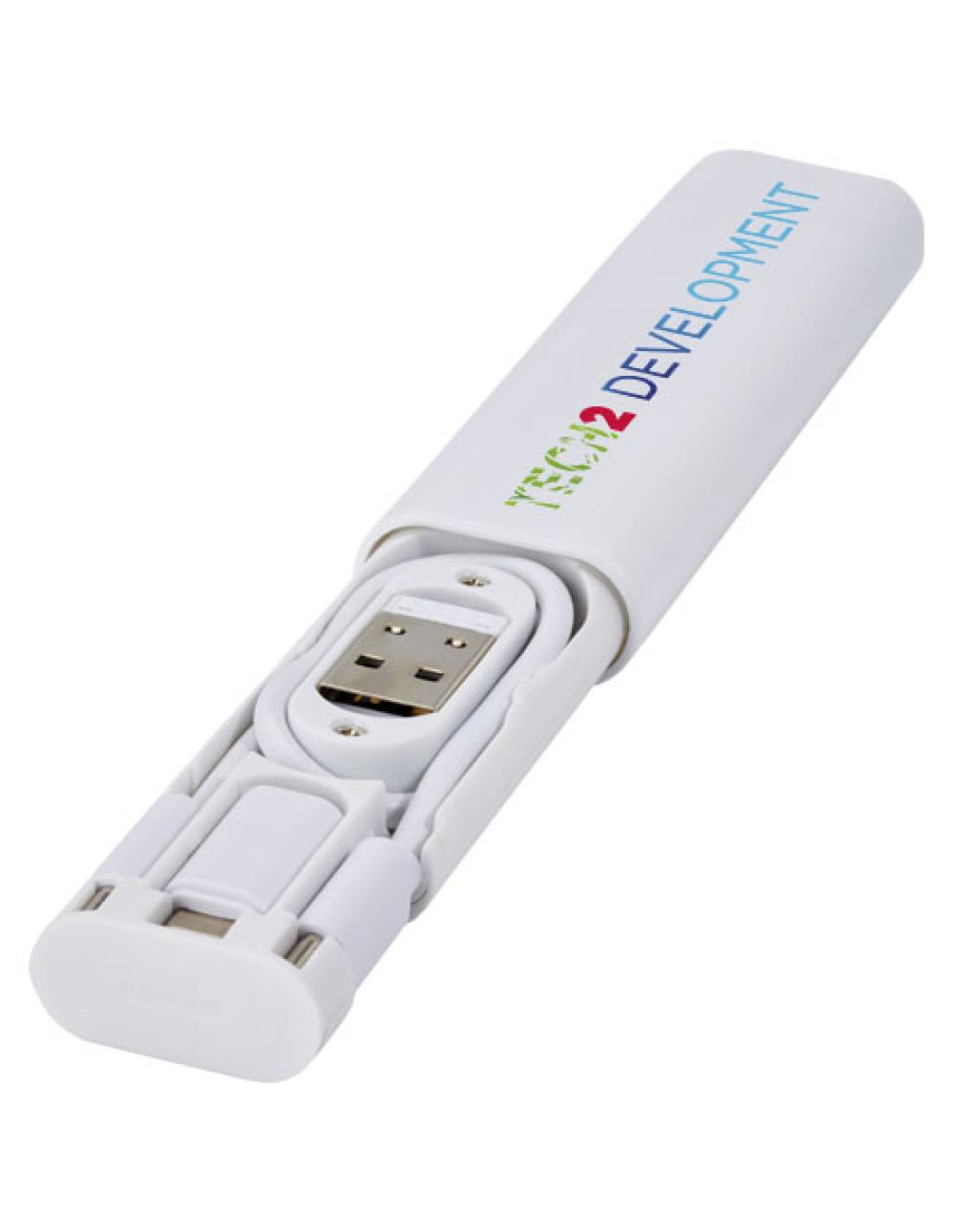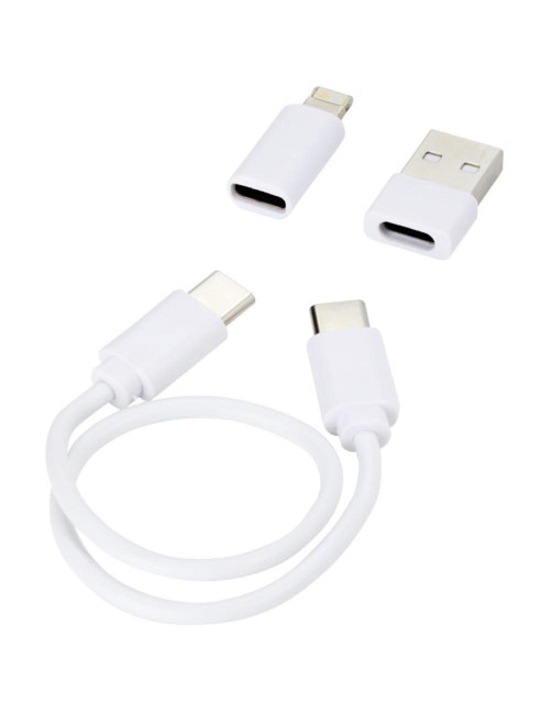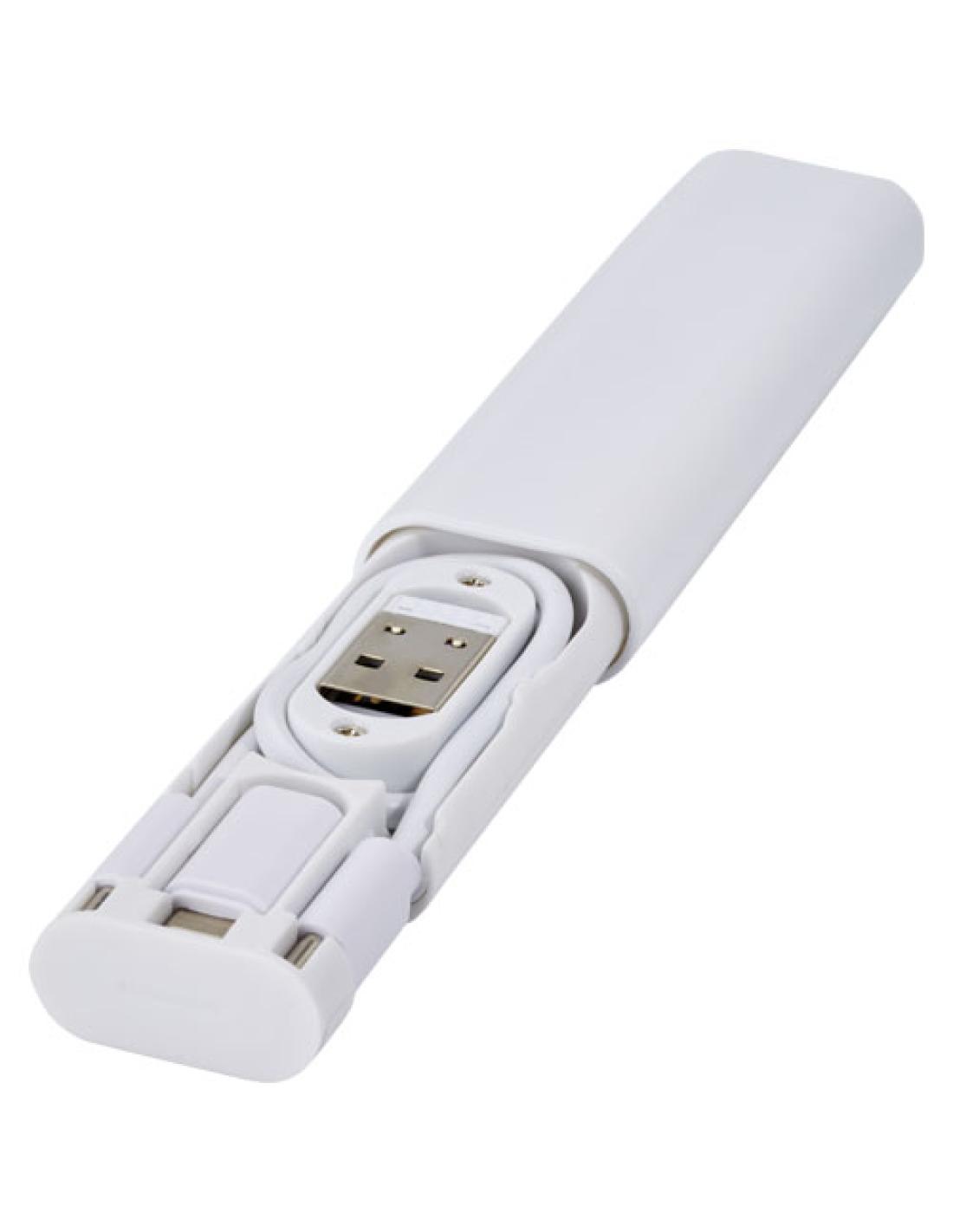 El cable modular de transferencia de datos y carga fabricado con plástico reciclado se entrega en un elegante estuche. El cable ofrece múltiples soluciones de carga: Entrada USB tipo C y A, y salida USB tipo C/iOS/micro. Gracias a todos estos adaptadores y conectores, este cable permite cargar la mayoría de smartphones, cámaras, baterías externas, auriculares, etc. El cable tiene una potencia de salida máxima de 2 A. Dispone de un pasador de expulsión que resulta muy útil para extraer la tarjeta SIM del teléfono. El estuche también tiene espacio para guardar una tarjeta de memoria micro SD, así como una tarjeta nano SIM, lo que lo convierte en el accesorio de viaje perfecto. Longitud del cable: 28 cm. Se entrega en un sobre de papel kraft 100 % reciclado.