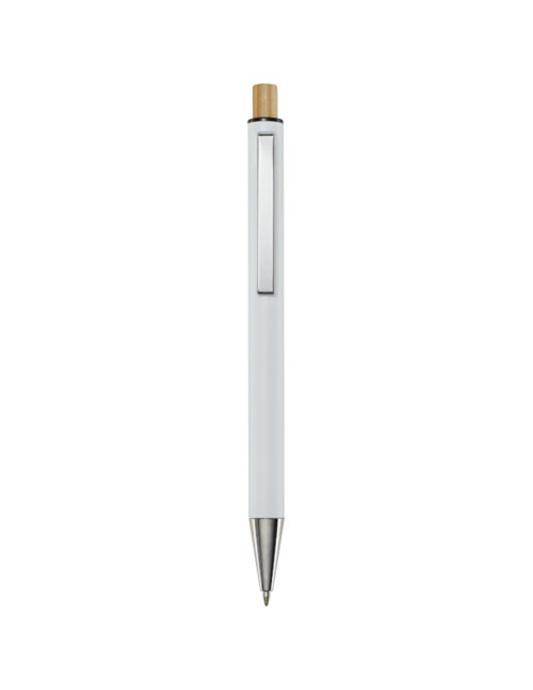 El bolígrafo "Cyrus" está fabricado con aluminio reciclado, que requiere menos energía que la producción de aluminio a partir de materias primas. También disminuye la cantidad de residuos en los vertederos y ayuda a conservar los recursos naturales con el objetivo de reducir las emisiones de gases de efecto invernadero. El pulsador está hecho de bambú. Color de la tinta: Azul. Longitud de escritura: 800 metros. Tamaño de la punta: 1,00 mm.