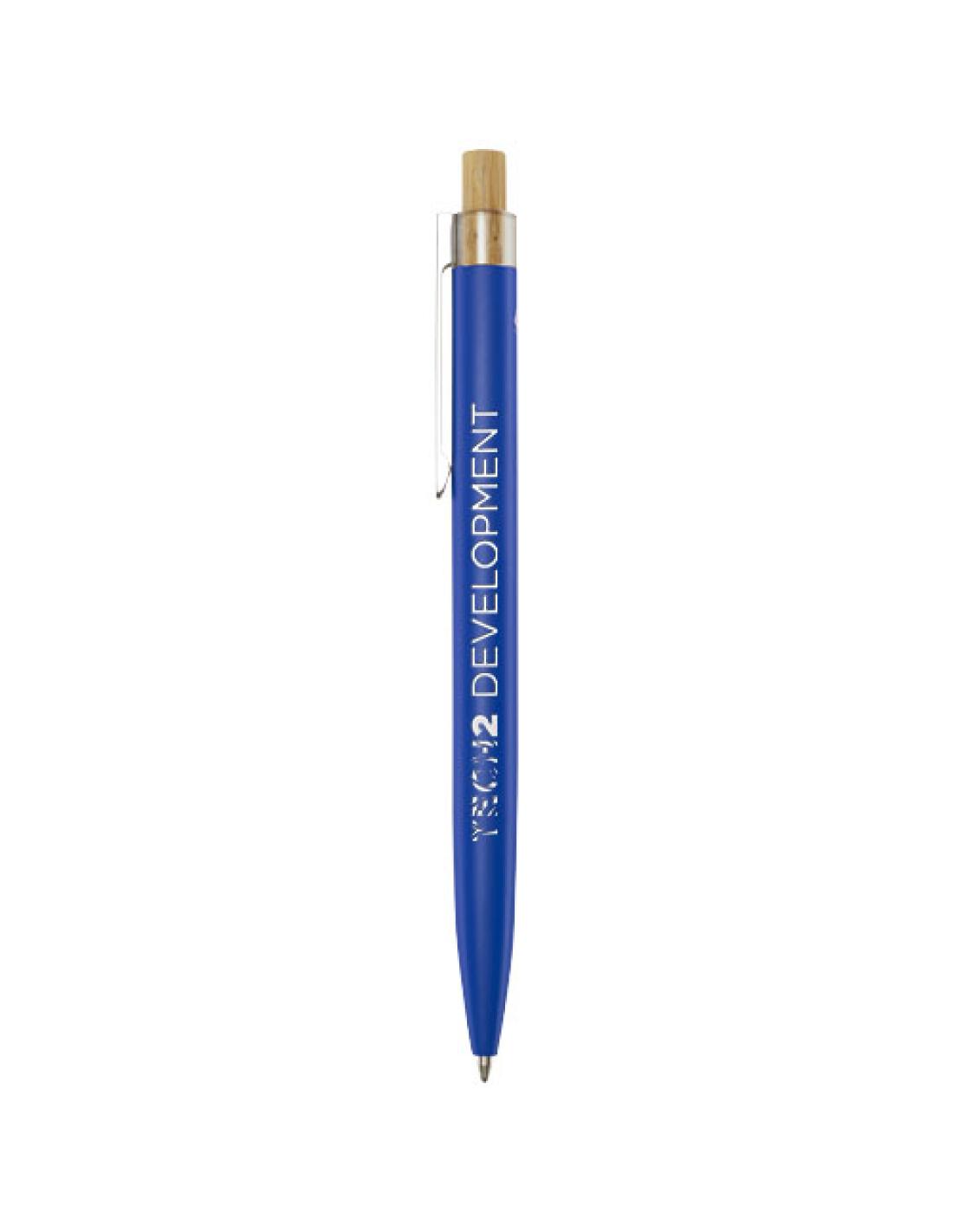 El bolígrafo "Nooshin" está fabricado con aluminio reciclado, que requiere menos energía que la producción de aluminio a partir de materias primas. También disminuye la cantidad de residuos en los vertederos y ayuda a conservar los recursos naturales con el objetivo de reducir las emisiones de gases de efecto invernadero. El pulsador está hecho de bambú. Color de la tinta: Azul. Longitud de escritura: 800 metros. Tamaño de la punta: 1,00 mm.