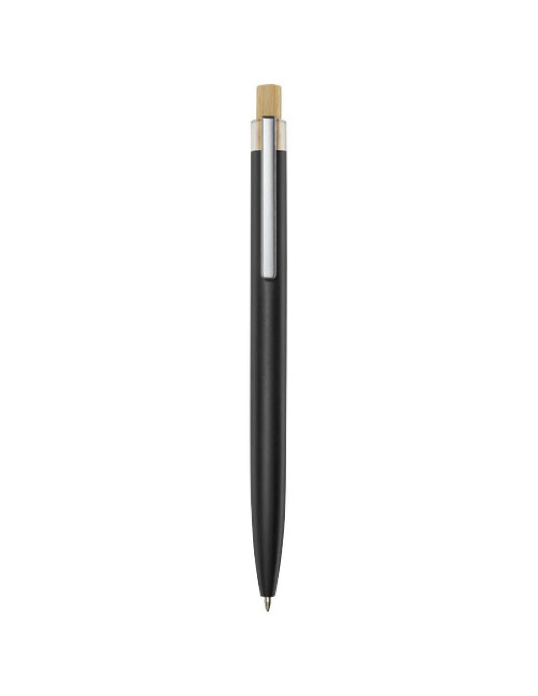 El bolígrafo "Nooshin" está fabricado con aluminio reciclado, que requiere menos energía que la producción de aluminio a partir de materias primas. También disminuye la cantidad de residuos en los vertederos y ayuda a conservar los recursos naturales con el objetivo de reducir las emisiones de gases de efecto invernadero. El pulsador está hecho de bambú. Color de la tinta: Azul. Longitud de escritura: 800 metros. Tamaño de la punta: 1,00 mm.
