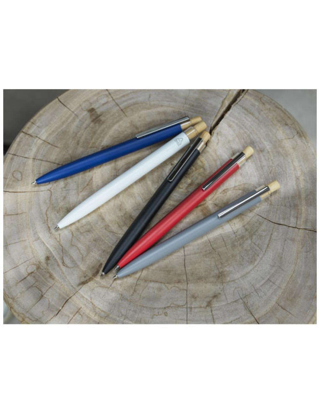 El bolígrafo "Nooshin" está fabricado con aluminio reciclado, que requiere menos energía que la producción de aluminio a partir de materias primas. También disminuye la cantidad de residuos en los vertederos y ayuda a conservar los recursos naturales con el objetivo de reducir las emisiones de gases de efecto invernadero. El pulsador está hecho de bambú. Color de la tinta: Negro. Longitud de escritura: 800 metros. Tamaño de la punta: 1,00 mm.