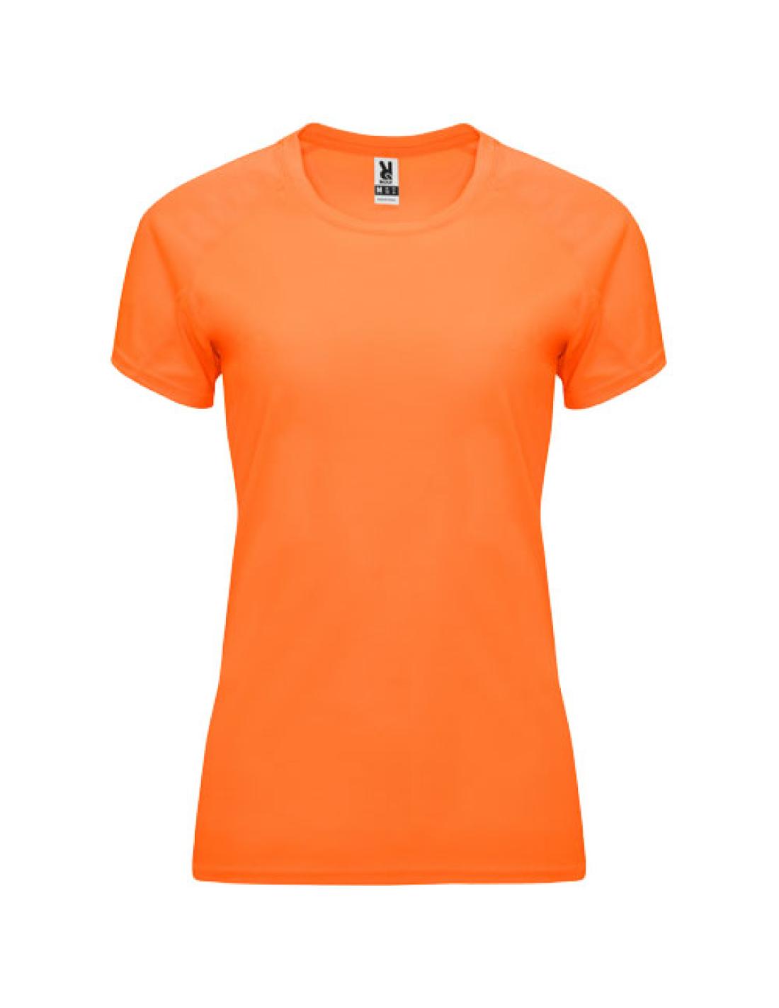 Camiseta técnica entallada de manga corta ranglán para mujer, con cuello redondo y cubrecosturas a juego. Paneles en mangas. Remallado a tono en sisa y panel de manga. Tejido CONTROL DRY. Etiqueta extraíble. Tejido técnico. Factor de protección UV. La modelo mide 173 cms y lleva la talla S.