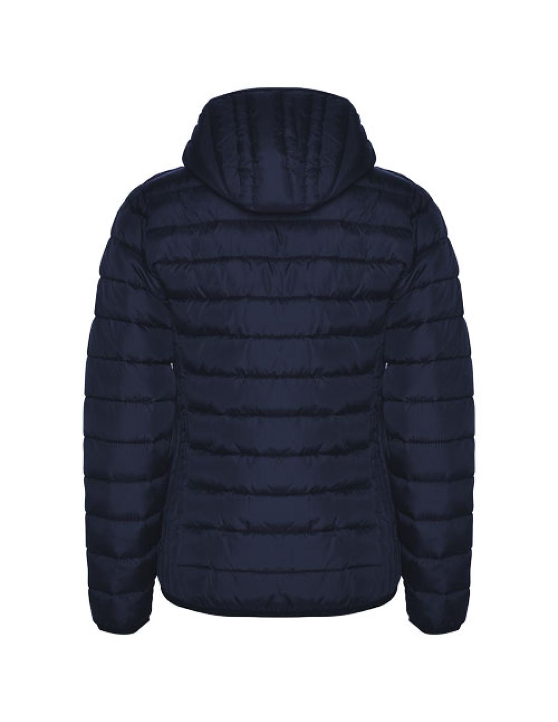 Chaqueta de mujer acolchada con relleno tacto pluma y capucha fija. Cremalleras invertidas con protector de barbilla a juego. Dos bolsillos laterales con cremallera. Ribete elástico a tono en puños, bajos y capucha. Forro interior a contraste. Incluye bolsa de transporte. Prenda ligera y plegable. Resistente al agua. Modelo a prueba de viento.