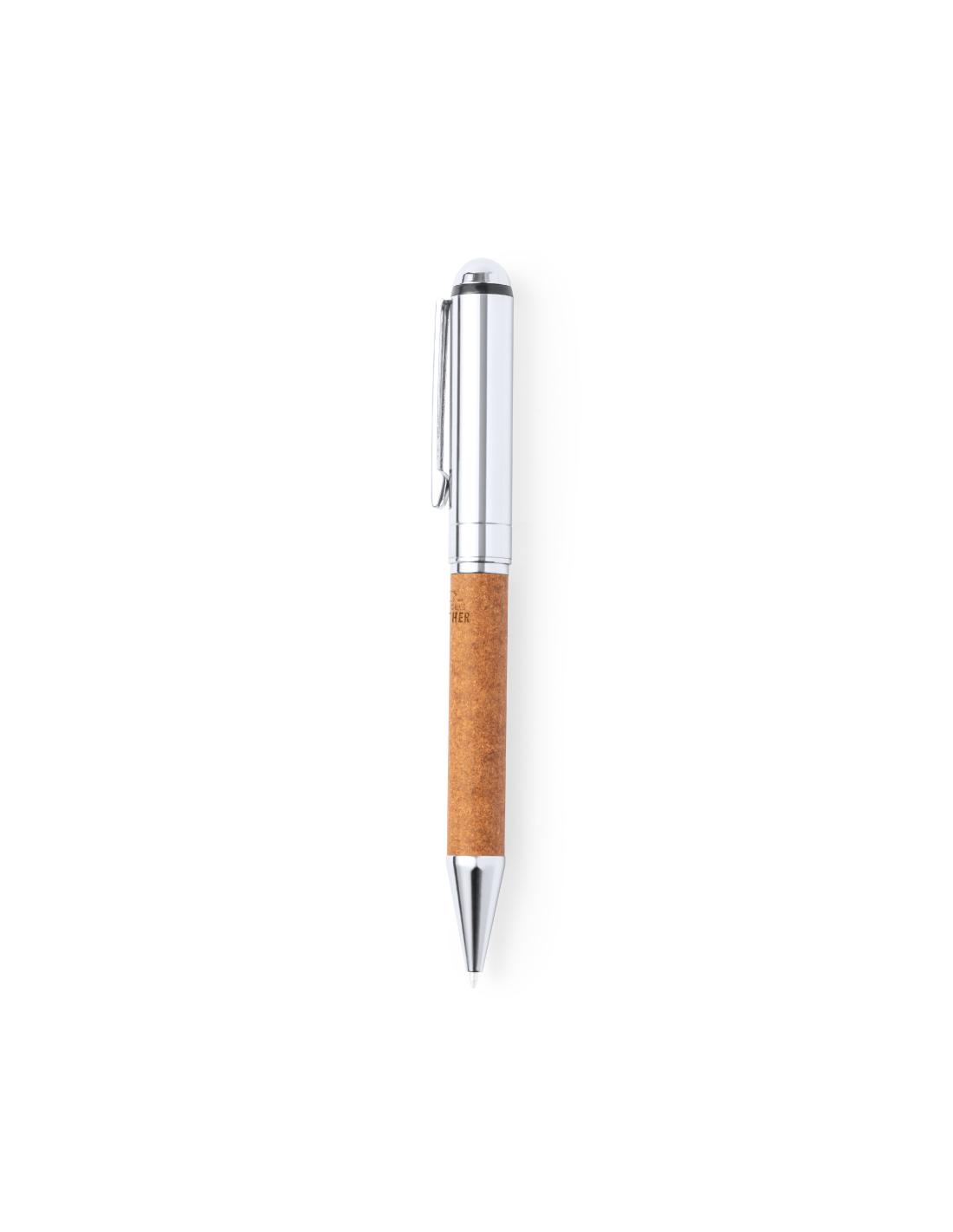Bolígrafo fabricado en metal cromado y con cuerpo recubierto en cuero reciclado. Elegante clip metálico y accesorios a juego, de mecanismo giratorio y en tinta azul. Con distintivo cuero reciclado en cuerpo y presentado en estuche individual de diseño kraft con funda a juego.El cuero reciclado rescata las fibras desechadas en los procesos de fabricación del cuero, minimizando el desperdicio de material, contribuyendo a reducir el impacto ambiental y manteniendo a la vez sus propiedades originales.
