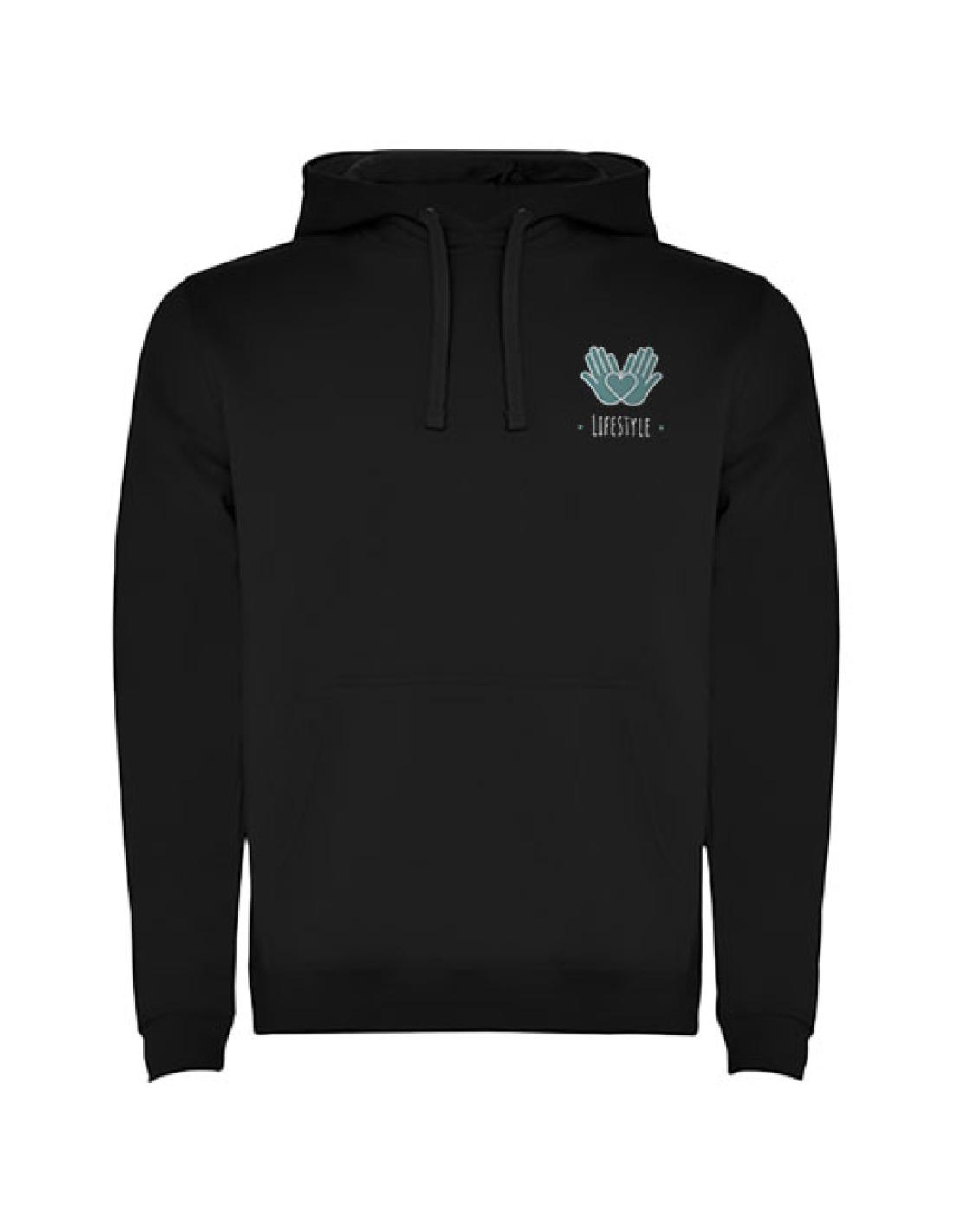 Sudadera con capucha de doble tejido bicolor, con cordón ajustable en contraste, con cubrecosturas reforzado y bolsillo tipo canguro. Disponible en acabado sólido o bicolor. Punto canalé con elastano 1x1 en puños y cintura. Etiqueta extraíble. El modelo mide 185 cms y lleva una talla M.