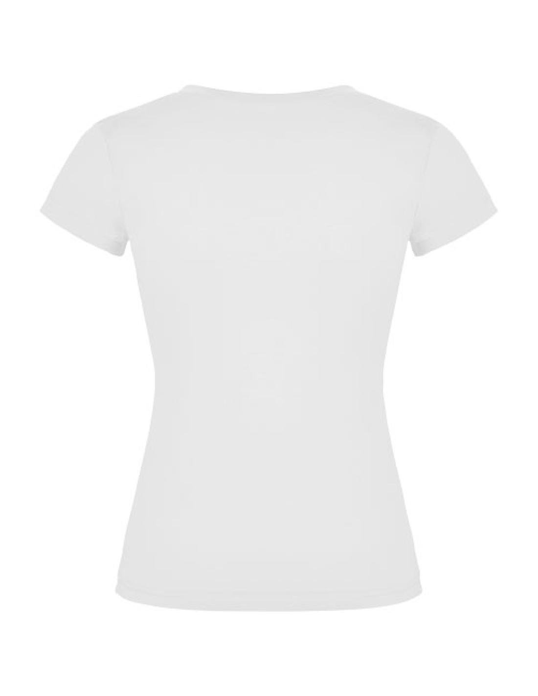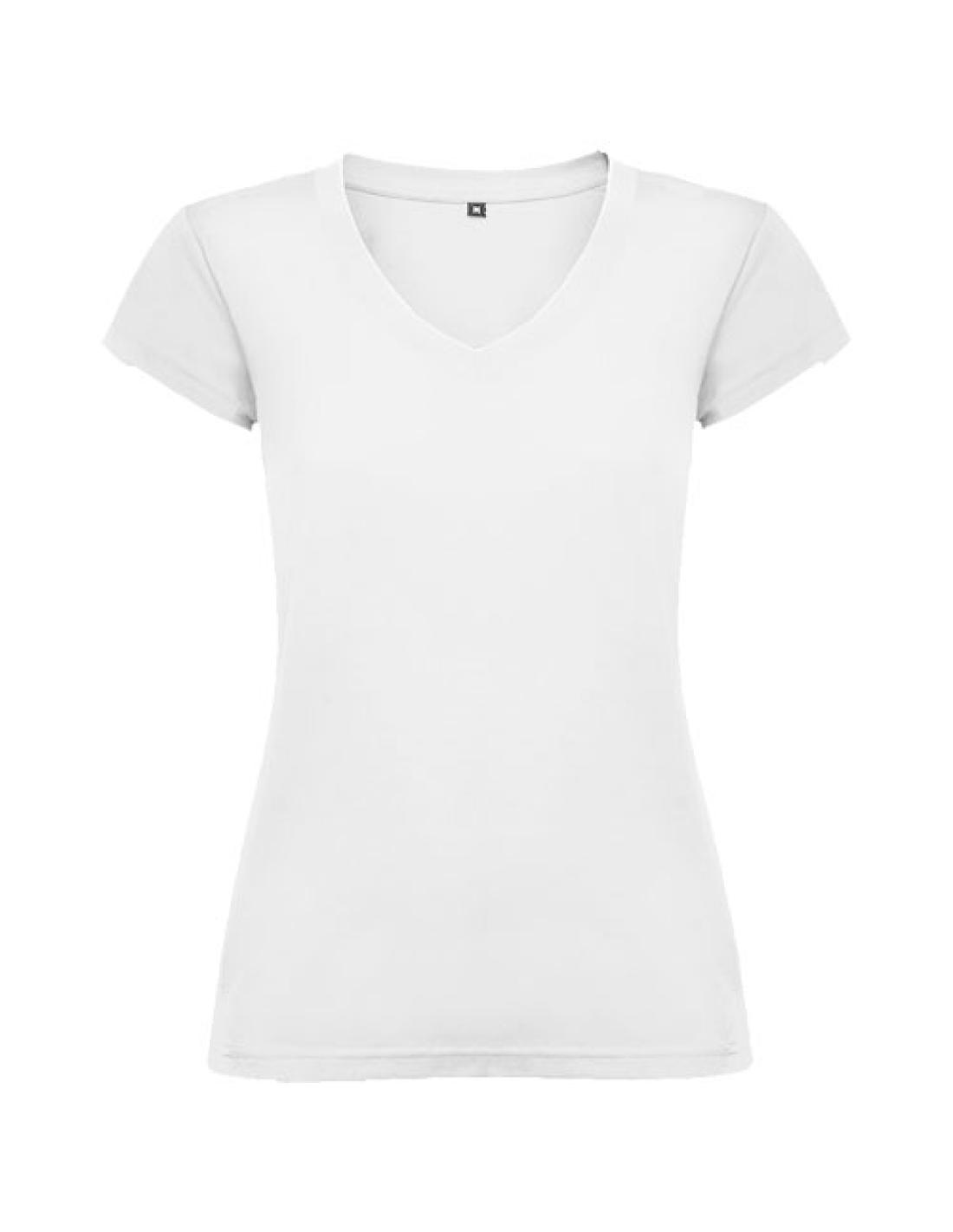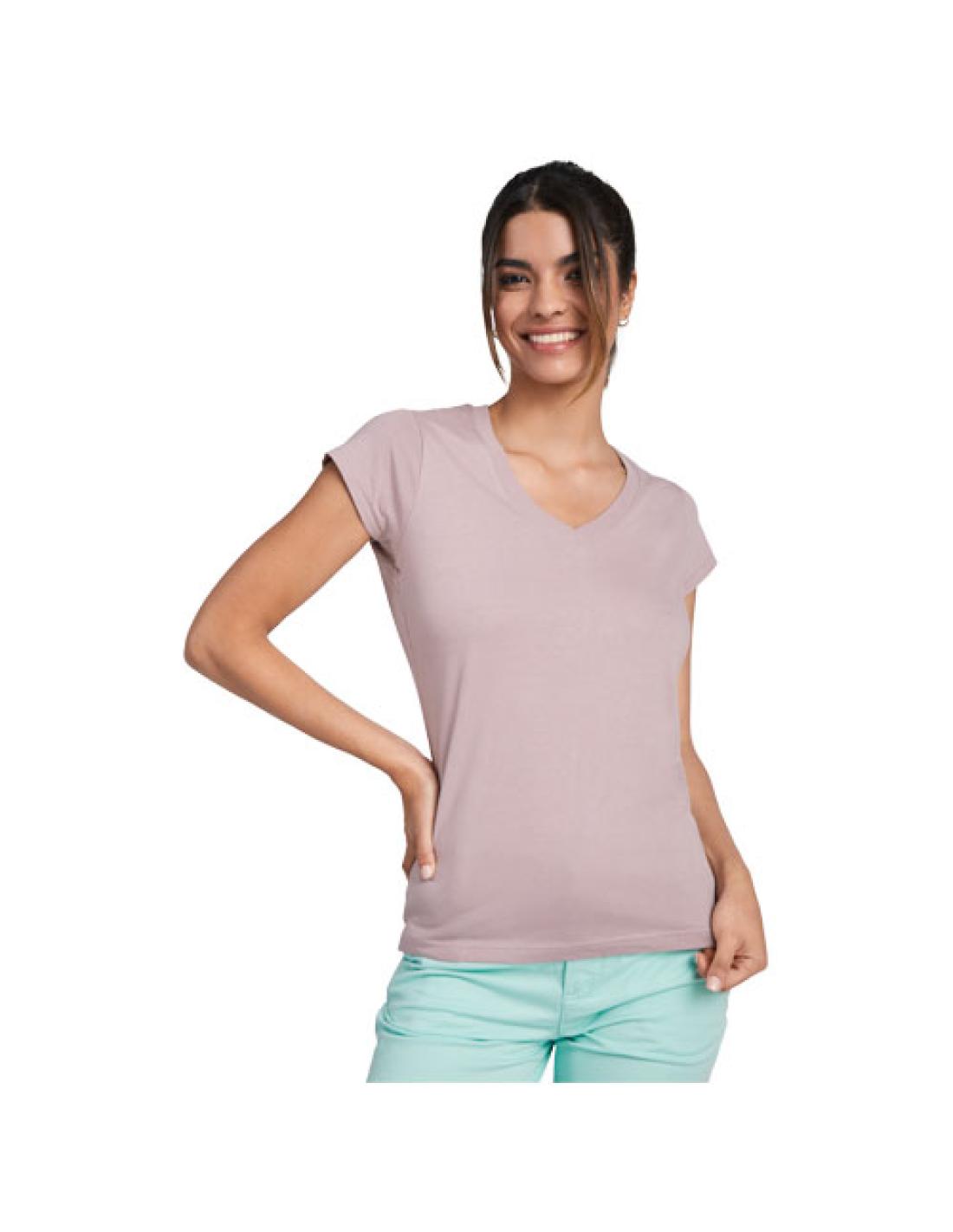 Camiseta de mujer con manga corta, cuello de pico y acabados en ribete de canalé 1x1. Corte entallado con costuras laterales. Etiqueta extraíble. La modelo mide 174 cms y lleva una talla S.