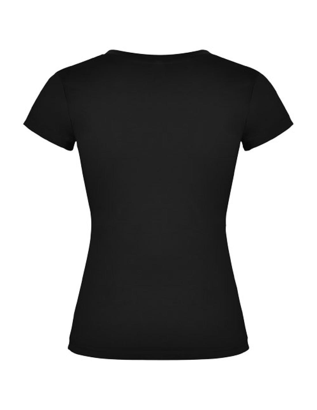 Camiseta de mujer con manga corta, cuello de pico y acabados en ribete de canalé 1x1. Corte entallado con costuras laterales. Etiqueta extraíble. La modelo mide 174 cms y lleva una talla S.