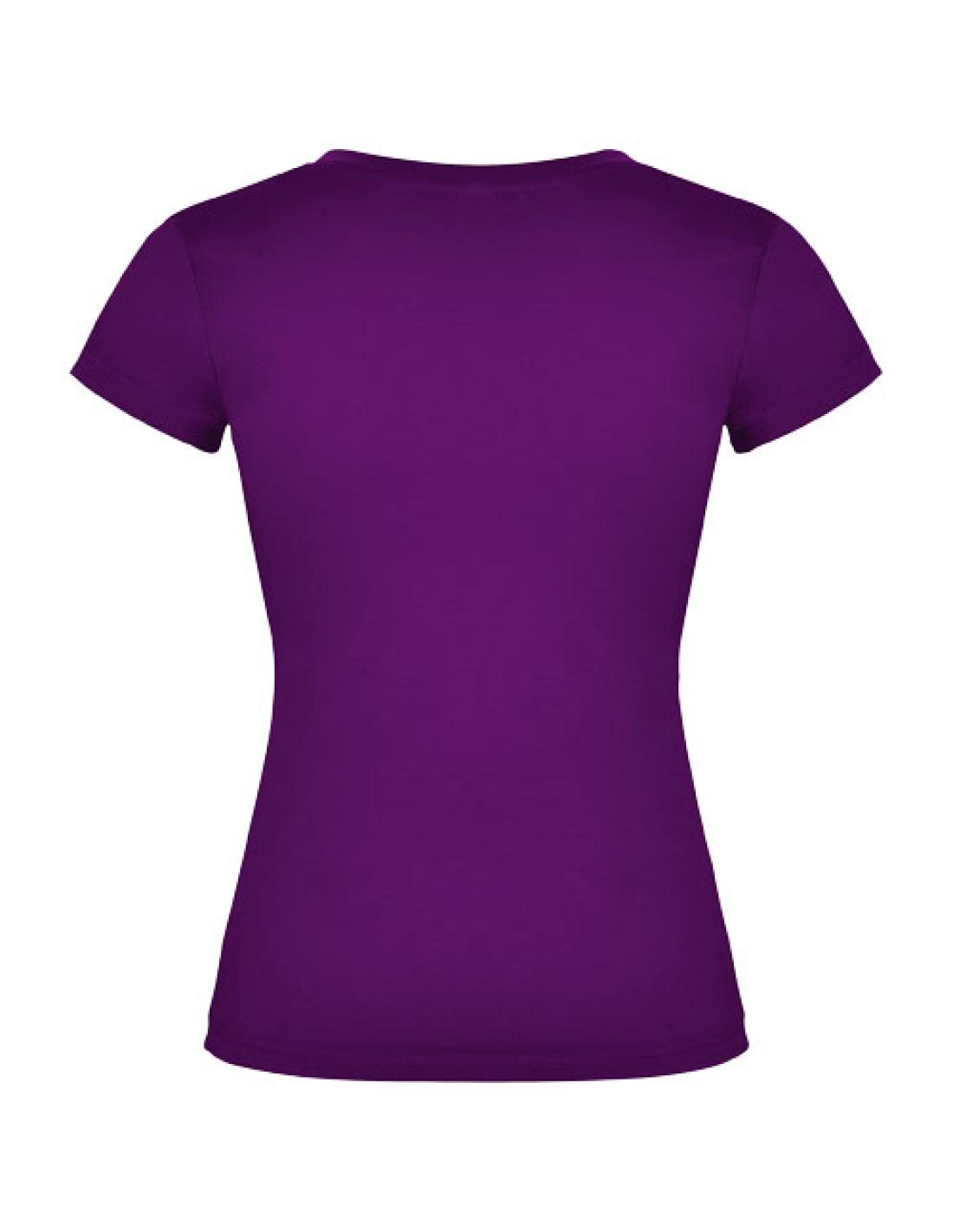 Camiseta de mujer con manga corta, cuello de pico y acabados en ribete de canalé 1x1. Corte entallado con costuras laterales. Etiqueta extraíble. La modelo mide 174 cms y lleva una talla S.
