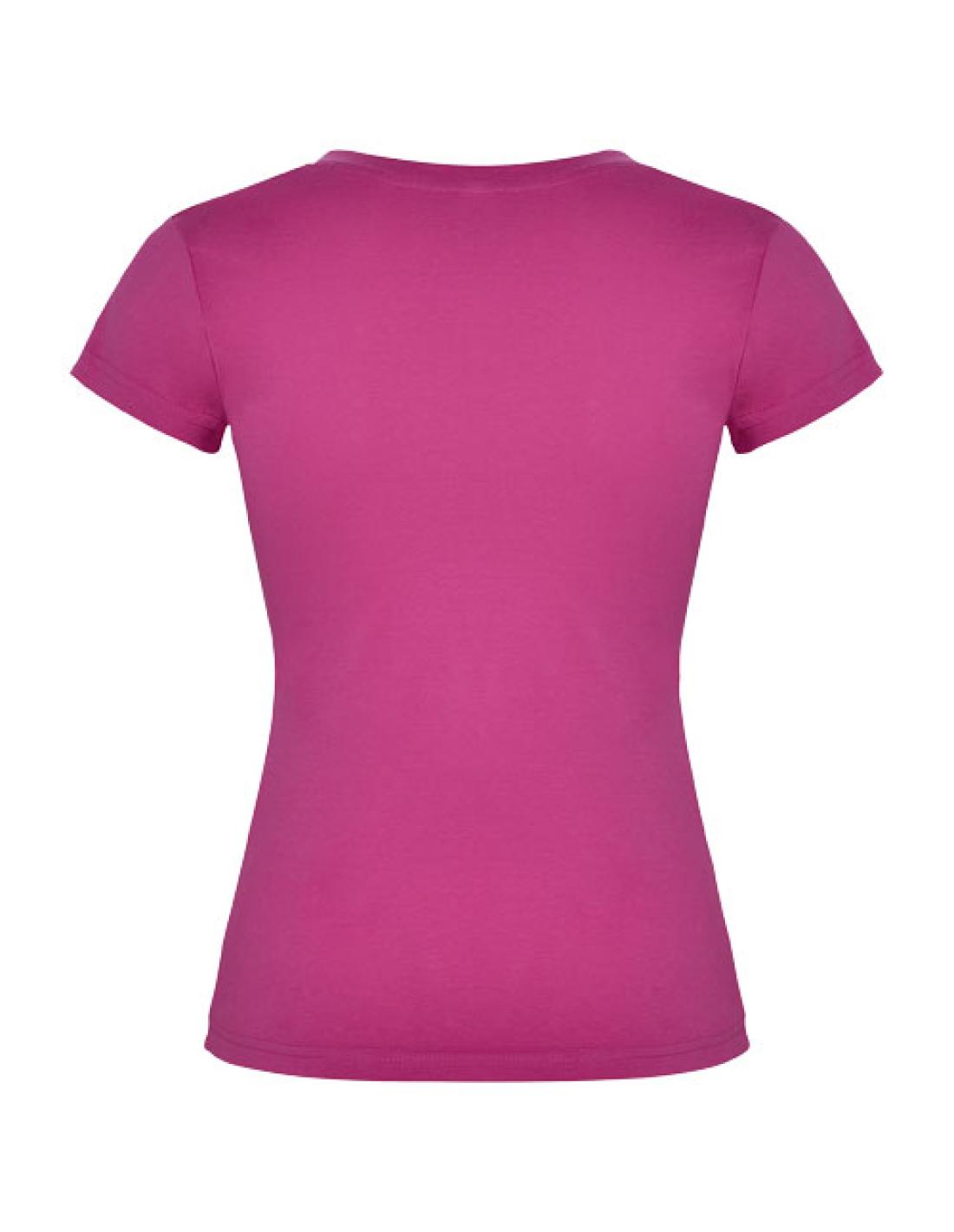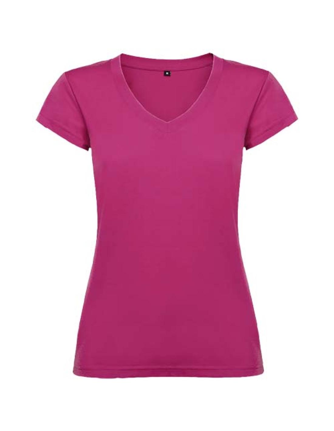 Camiseta de mujer con manga corta, cuello de pico y acabados en ribete de canalé 1x1. Corte entallado con costuras laterales. Etiqueta extraíble. La modelo mide 174 cms y lleva una talla S.