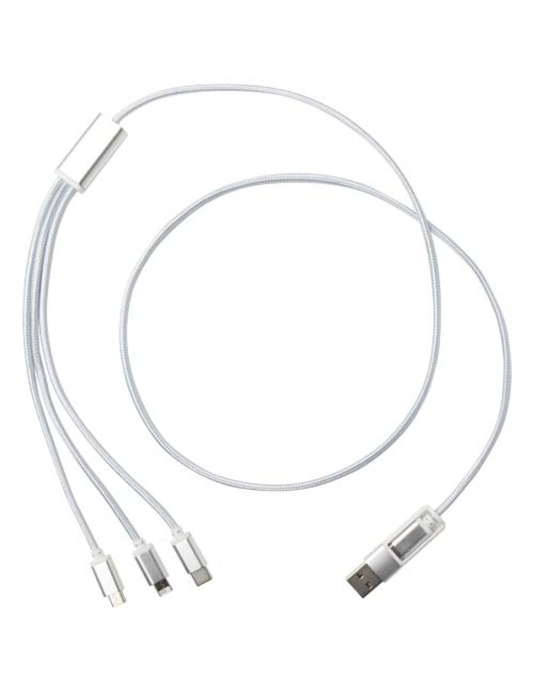 Este cable cuenta con un conector de entrada USB A y otro tipo C, además de un conector de salida tipo C, un Micro USB y un conector combinado Lightning/Micro USB. Gracias a todos estos conectores, podrás cargar la mayoría de smartphones iOS/Android, cámaras, baterías externas y auriculares. El cable mide 100 cm y está fabricado con aluminio reciclado y rPET.